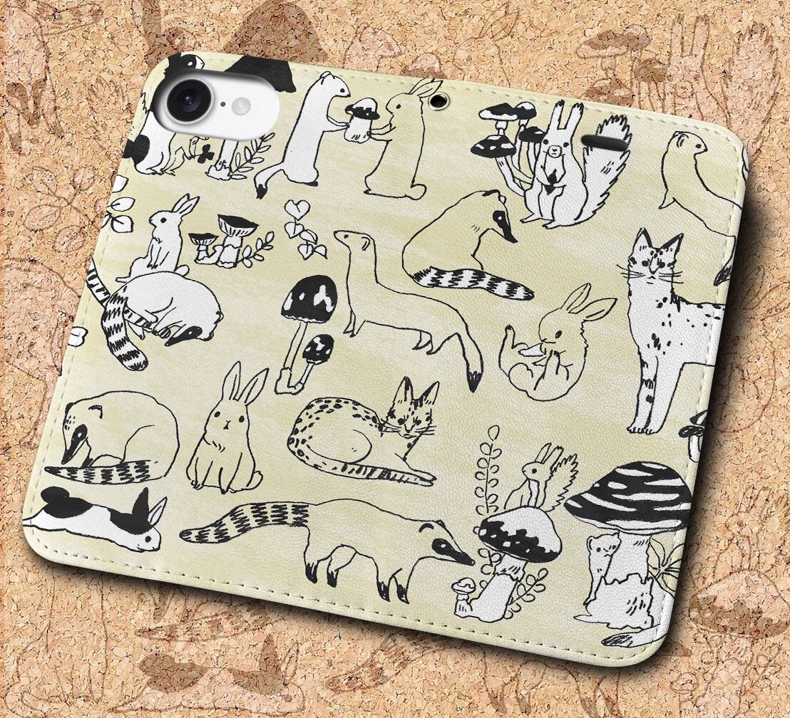 iPhone対応 スマホ 手帳型ケース きのこの森の動物 ポップ イラスト 【iPhone17 / iPhone16 / iPhone16e / iPhoneSE 他 iPhone各機種対応】 st42