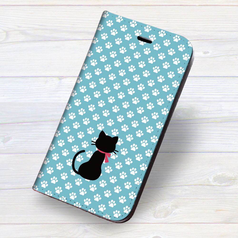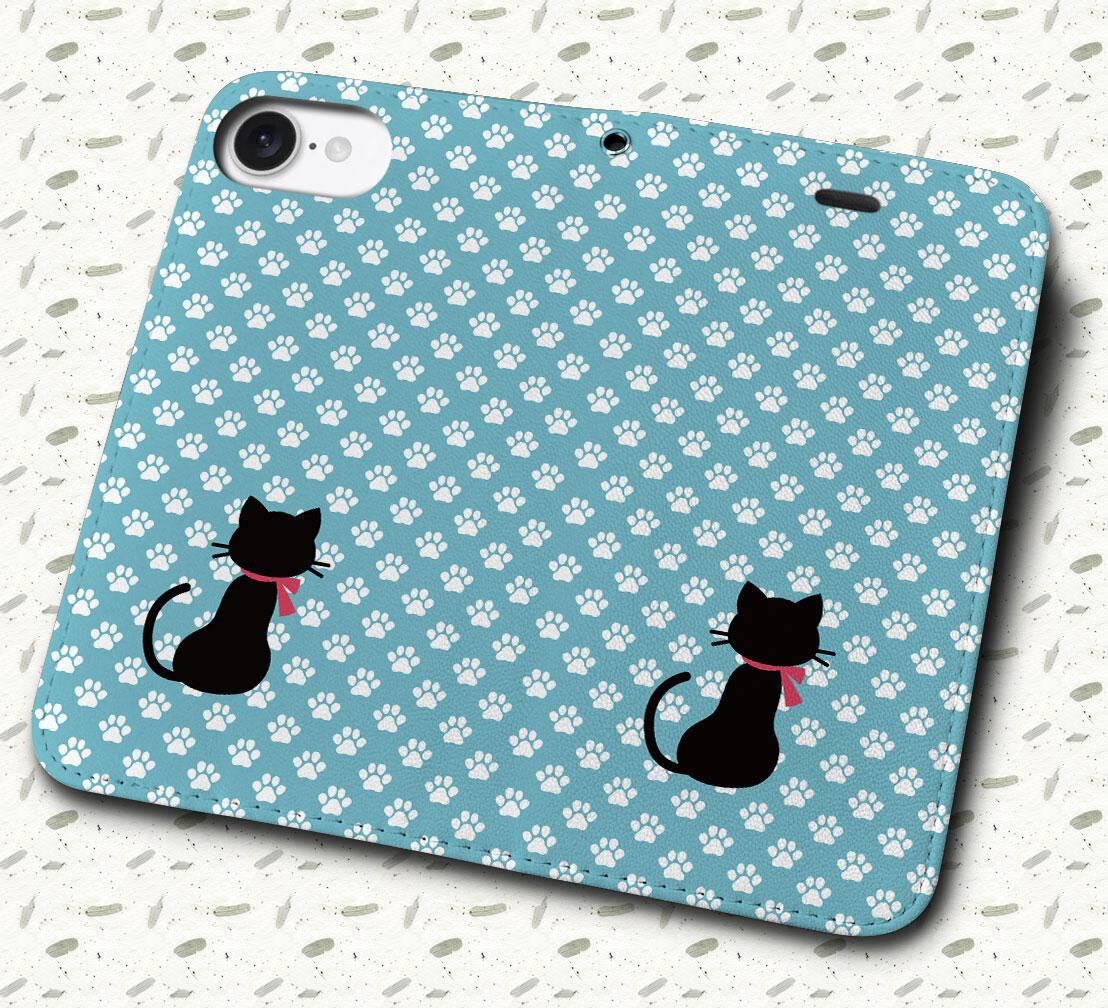 iPhone対応 スマホ 手帳型ケース 黒ネコと足跡-ブルーD ポップ イラスト猫 【iPhone17 / iPhone16 / iPhone16e / iPhoneSE 他 iPhone各機種対応】 st47