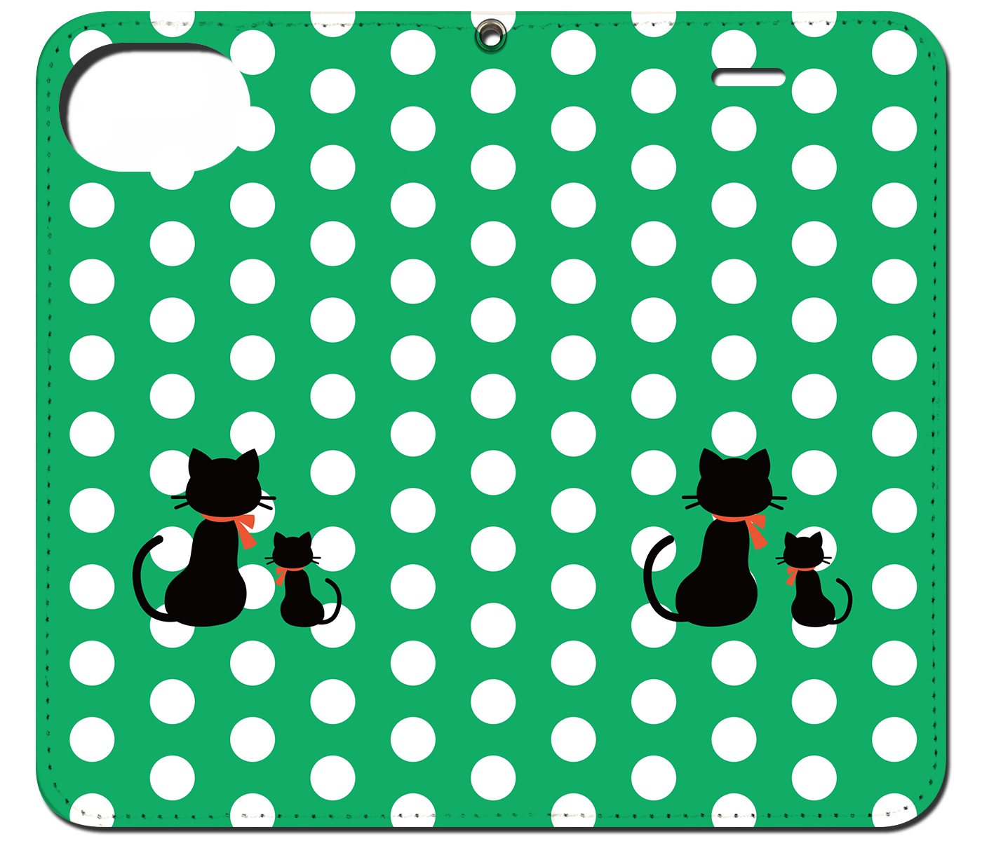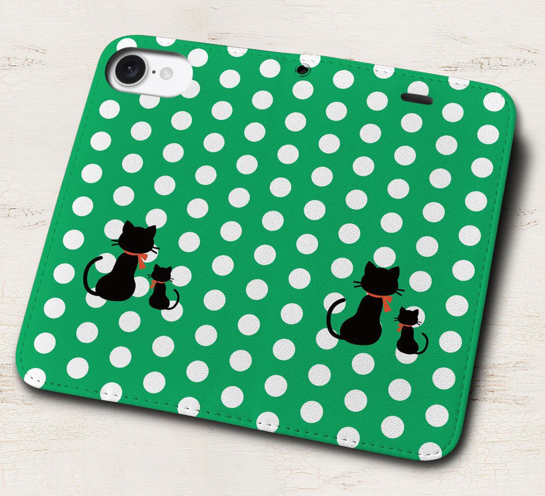 iPhone対応 スマホ 手帳型ケース 親子猫白ドット-グリーン ポップ イラストネコ 【iPhone17 / iPhone16 / iPhone16e / iPhoneSE 他 iPhone各機種対応】 st47