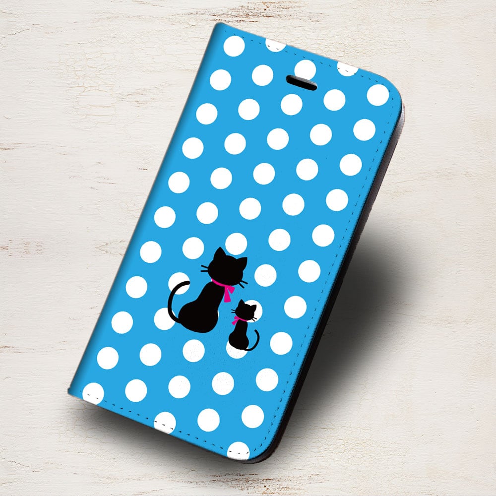 iPhone対応 スマホ 手帳型ケース 親子猫白ドット-ブルー ポップ イラストネコ 【iPhone17 / iPhone16 / iPhone16e / iPhoneSE 他 iPhone各機種対応】 st47
