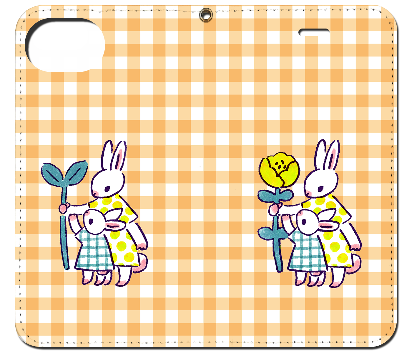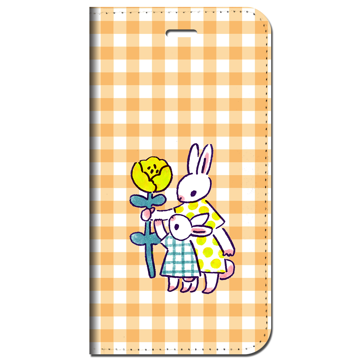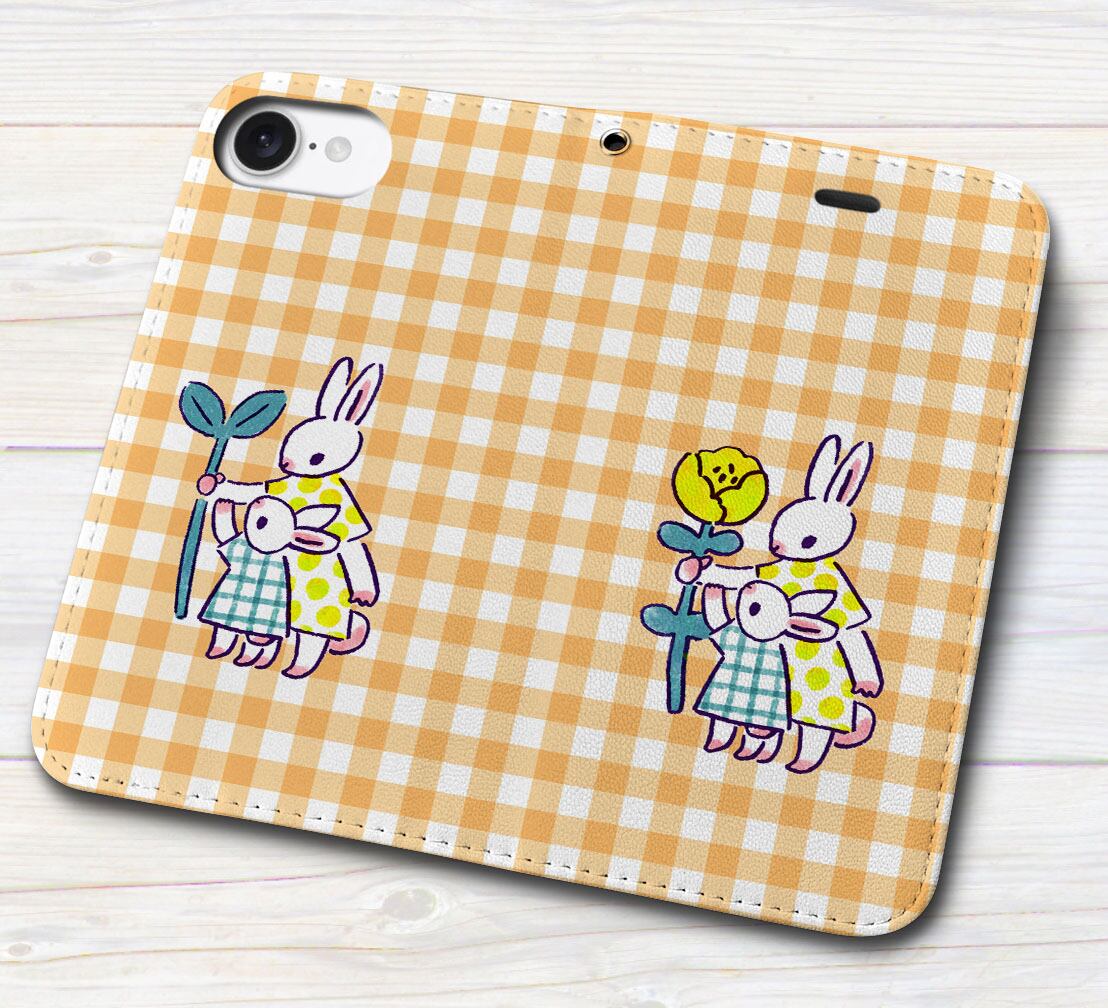 iPhone対応 スマホ 手帳型ケース うさぎの親子 チェックオレンジ イラスト キュート 動物 【iPhone17 / iPhone16 / iPhone16e / iPhoneSE 他 iPhone各機種対応】 st63