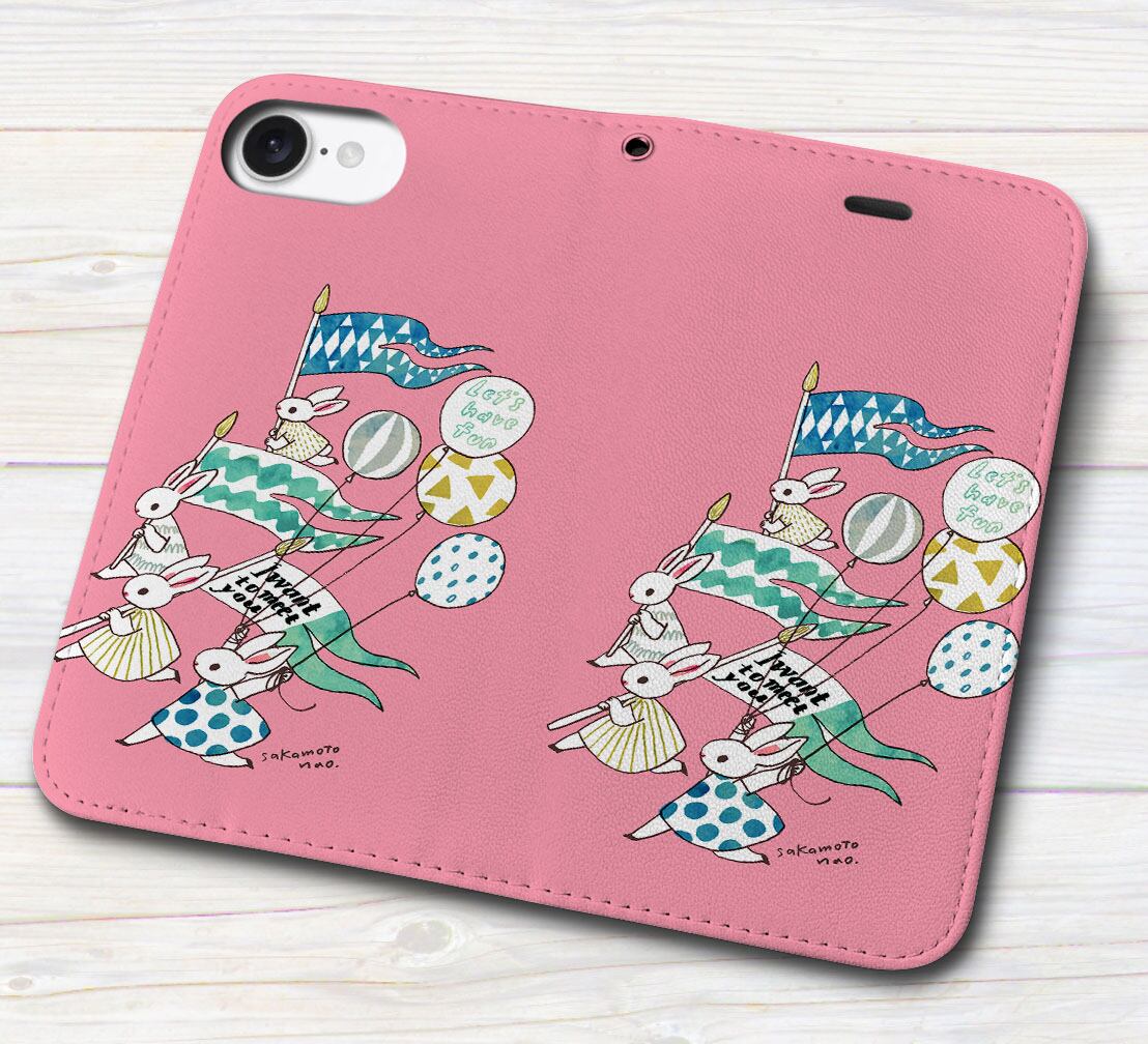 iPhone対応 スマホ 手帳型ケース ラビット行進2 ピンク イラスト キュート 動物 【iPhone17 / iPhone16 / iPhone16e / iPhoneSE 他 iPhone各機種対応】 st63