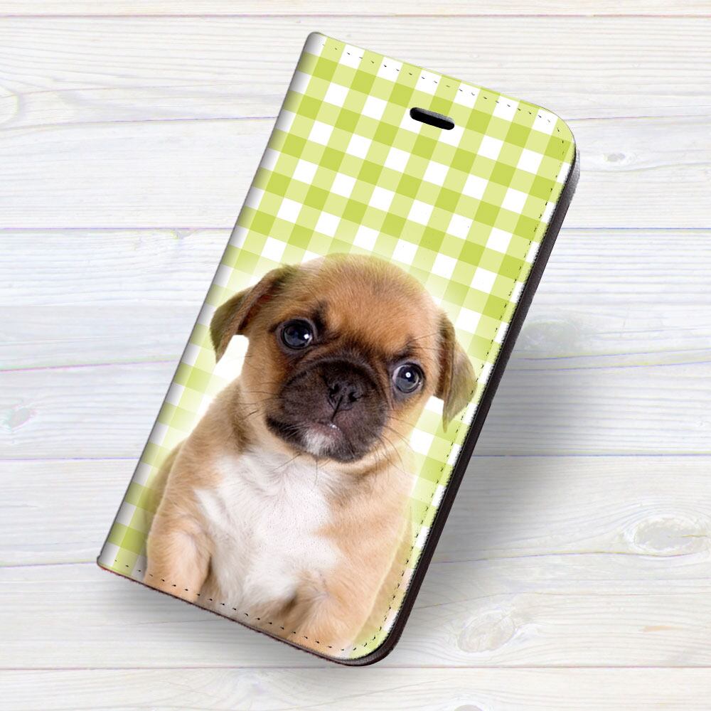 iPhone対応 スマホ 手帳型ケース パグ02 チェックイエローグリーン 動物 ペット犬 イヌ 【iPhone17 / iPhone16 / iPhone16e / iPhoneSE 他 iPhone各機種対応】 st65
