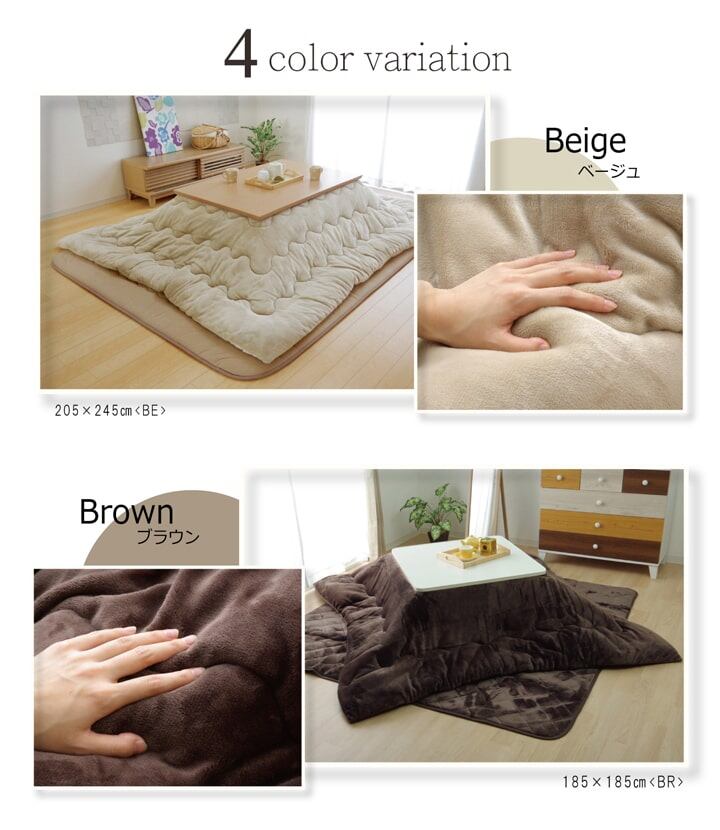 中わたに抗菌防臭加工を施した無地のこたつ布団です。側地には柔らかく、肌触りの良いフランネル生地を使用してます。毛足が短いので掃除機もかけやすく、毛足にゴミや埃が絡みにくいという特長もあります。両面使用可能なリバーシブルタイプです。また、表地の素材が同じで同色のキルトラグも別途取扱いがありますので、トータルでのコーディネートもおすすめです。こたつの特長として1.省エネルギー、こたつは必要なところだけを暖める省エネルギー暖房器具です。2.クリーン、こたつは二酸化炭素など有害物質を出さないのでクリーンです。3.団らんの場、家族や友達が一緒にくつろげる空間、心も体もポッカポカになります。※本商品は圧縮梱包でのお届けとなります。商品が届きましたらお早めに開梱して頂き、2~3時間日陰干しをして頂くと復元が早まります。