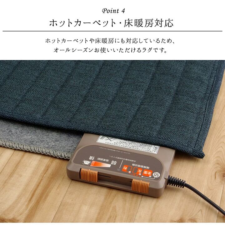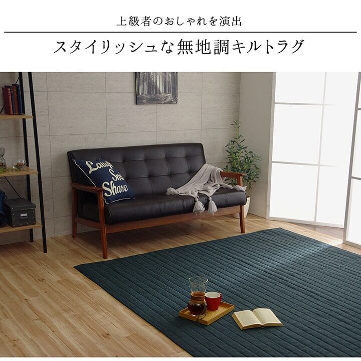 スタイリッシュな無地のキルティングラグカーペットです。キルティング加工をすることで、中わたが寄ったりズレたりしにくく、立体感とボリューム感が出ます。表地に若干の光沢をプラスすることで、シンプルなのにおしゃれで高級感のある雰囲気に仕上げました、また、サラッとした肌触りの生地を使用していますので、季節を選ばず年間ご使用頂けます。中材にはウレタン5mmを使用していますので、適度なクッション性があります。ホットカーペットカバーとしてもご使用頂けます。ご家庭の洗濯機で洗える(ネット使用)ので清潔にご使用頂けます。※滑りやすい床面等でご使用される際には、市販の滑り止めを敷いて下さい。