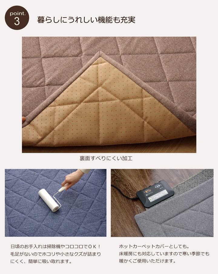 デニム調のキルティングラグカーペットです。キルティング加工をすることで、中わたが寄ったりズレたりしにくくなります。表地にはしなやかで伸縮性のある生地を使用しています。とても柔らかくソフトな風合いです。中材には固わたを使用しており、適度なクッション性があります。フローリングを傷つけにくいよう、裏には不織布を貼っています。またすべりにくい加工も施しておりますのでフローリングでも安心してご使用頂けます。ホットカーペットカバーとしてもご使用頂けます。床暖房にも対応可です。季節を選ばすオールシーズンご使用頂けます。