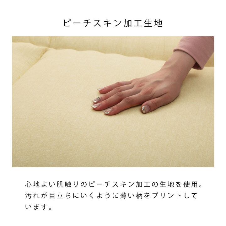 ダニ0(ZERO)への挑戦! 毎日使うお布団、少しでも「清潔」かつ「気持ち良く」使いたい方へ、そんなご要望にお応えできる商品を開発しました。ダニ増殖抑制99%を実現する特殊滅ダニシートを使用しています。安心の国内生産です。表地には心地よい肌触りのピーチスキン加工の生地を使用しています。中材が3層構造になっており体をしっかり支えてくれます。 四つ折り可能なキルト縫製を施していますので、コンパクトに折り畳む事ができ使わない時の収納に便利です。