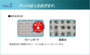 生地にマイガードを使用しています。マイガードは繊維と繊維の隙間が少ない高密度生地なので、ほこりの原因となる糸切れ、毛羽立ち、中綿の吹き出しを防ぎハウスダストを大幅に低減します。またダニの侵入を防ぎクリーンで快適な睡眠をサポートします。