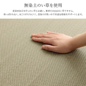 その作業をしない無染土い草を使用した商品です。泥染め加工を行ったい草とは違い、素材そのままのい草ですから、粉っぽさもなく、ほこりがたちにくく、肌触りが良いので快適な睡眠をサポートします。