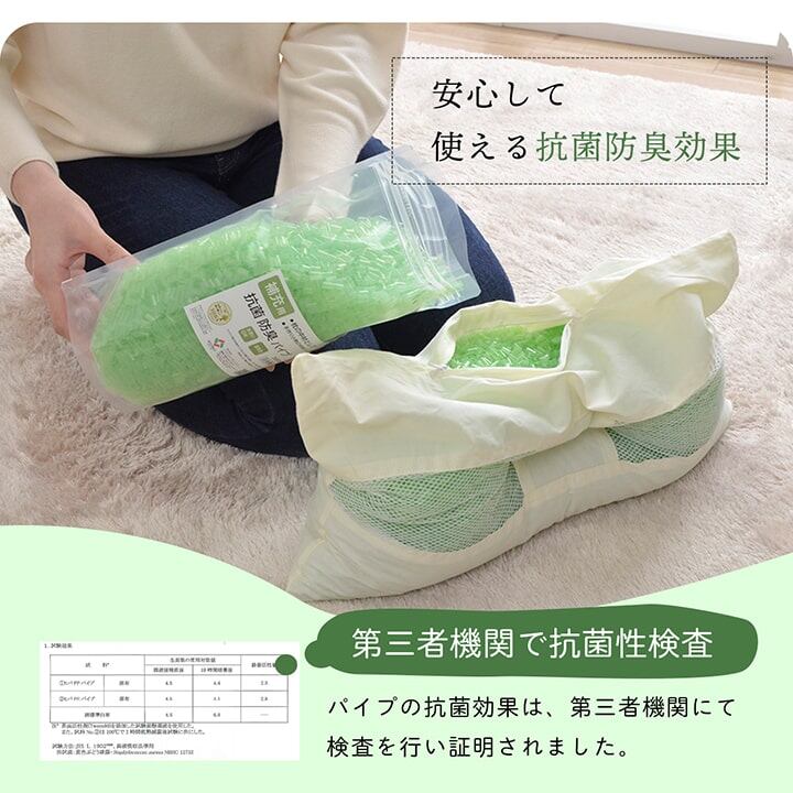 ヒバエッセンス練り込みパイプを使用しています。青森県のヒバの木から抽出した「ヒバエッセンス」をメーカー独自の技術でパイプに加工しました。ヒバエッセンスにはヒノキチオールという、天然物質としては極めて抗菌性の高い成分が含まれています。(無加工品に比べ、抗菌・防臭効果があります。)ヒバエッセンスで安らかな森の眠りをご提案します。ご家庭で簡単に洗えます。