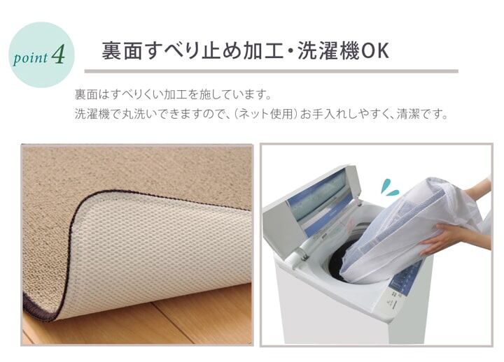 シンプルな無地のキッチンマットです。あえて厚さを薄め(約7mm)にすることにより、システムキッチンでも引っかかりにくい仕様にしています。裏面には滑りにくい加工を施しています。ご家庭の洗濯機で洗えます(ネット使用)ので、清潔にご使用頂けます。