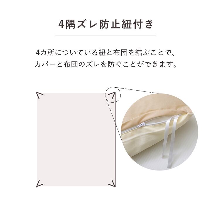 サラッとした肌触りのリバーシブルタイプのカバーです。選べる6色展開です。季節を問わず、オールシーズンご使用頂けます。素材が同じで同色の敷き布団カバー、枕カバーも別途取り扱いがありますのでトータルでのコーディネートもお勧めです。ご家庭の洗濯機で洗えます(洗濯ネット使用)。乾きやすい仕様になっておりますのでお手軽で清潔にご使用頂けます。本商品はフルオープン式ファスナー付きで、縦方向にファスナーが付いているためスムーズな出し入れが可能です。また、掛け布団カバーには、お布団とカバーがズレにくいよう四隅に固定ヒモを付けております。