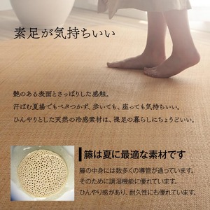 インドネシア原産の5年〜7年育成された籐(ロンティ)を使用しているあじろ商品です。夏を快適に過ごす素材として長年重宝されています。6畳編むのに3週間かかる手の込んだあじろ織り独自の編み模様が高級感と涼感をかもしだすます。冷たくしなやかでとても肌触りがよく、籐だけで編んでいますのでとても長く10年以上使用できる逸品です。使い込むほどに綺麗な飴色に変化していきます。