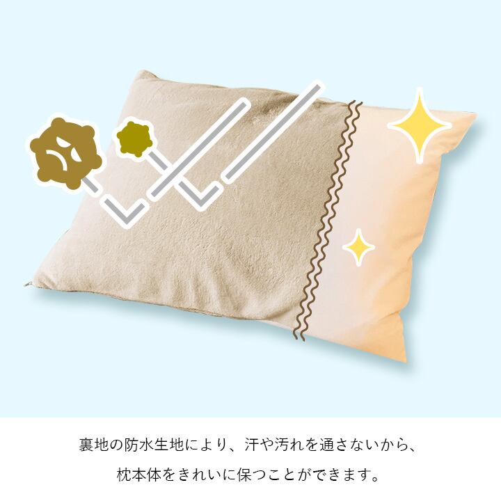表地はタオルのようなサラサラ生地。裏地は防水生地で汗や汚れから枕を守る。