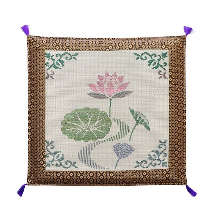 お盆の準備や、新しくご仏壇をご購入された方にお勧めの御前ござです。袋織りという技法で仕上げました。折れ曲がりが複雑なので長いイ草を使用しないと切れてしまいます。縦糸が密なので、しっかりとして破れにくいのが特徴です。国産(九州産)のい草を使用しています。一本一本が太く、表皮が厚く繊維がキメ細かいので弾力性があり、耐久性に優れています。い草には空気の自然浄化作用、湿度の調節作用などがあります。また汚れにくく、使用するうちに黄金色に変化し味が出ます。い草にヒバエッセンス加工を施しています(抗菌防臭効果)。