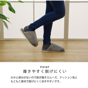 ご自宅用・来客用・オフィス用など幅広くどんな場面でもご使用いただけます。プレゼントにもおすすめです。ラビットファータッチのしっとりふわふわした肌触りで素足で履くことも可能です。履いた時にフィットするので脱げにくく歩きやすいルームシューズです。裏側はPVC素材を使用しており、汚れた際は水拭きする事ができ、お手入れも簡単です。