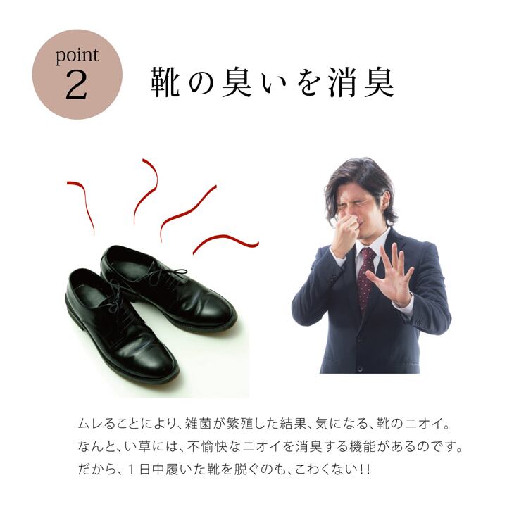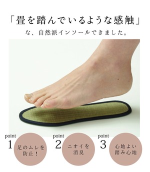 い草を使用したインソールです。い草の消臭効果・湿度調整機能で、蒸れを抑え、臭いを消臭する効果があります。革靴やスニーカーなどにもおすすめです。サイズは22cmから27cmまでご用意しています。