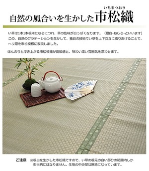 珍しい(ヘリ際のみ)市松柄の上敷きです。上敷きを敷くだけで畳のお部屋をリフレッシュ出来ます。日焼けしてしまった畳のリフレッシュに、新品の畳を汚さないためのカバーにご使用下さい。メーカー独自の技術で織機を改造し、素材の本来の色と織りだけで市松柄を表現しました。無地の上敷きでは個性がない、もっと高級感のある上敷きがほしいという方にお勧めです。長さ115〜120cm程の国産(イ草の産地熊本県八代産)い草を使用しています。そのうち約91cmを使用しています。通常ヘリ際は強く白みを帯びます。(日焼けではありません、い草の根元と先端部分の色です。)このイ草の根元と先端の色が違う特徴を活かし、市松柄を表現しております。(なので、根元の白い部分の範囲内しか市松柄になりません。真中部分は無地になります。)い草は長いものほど高級になります。い草は先端部分が赤茶色く、根元が白く真中が青(緑)色です。国産(熊本県八代産)のい草を使用しています。国産い草は一本一本が太く、表皮が厚く繊維がキメ細かいので弾力性があり、耐久性に優れています。い草には空気の清浄化作用、湿度の調節作用があり、汚れにくいといった特徴があります。青森県のヒバの木から抽出した「ヒバエッセンス」をメーカー独自の技術で生地表面に加工しました。ヒバエッセンスにはヒノキチオールという、天然物質としては極めて抗菌性の高い成分が含まれています。(無加工品に比べ抗菌、防臭効果があります。)表裏の両面が使えて経済的です。※自然素材であること、また職人が一つ一つ手作業にて加工を行うため、形状のバラツキや表示サイズと多少ことなることがあります。ご了承下さい。