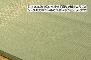 織りで柄を出した、ベーシックな無地花莚です。国産(九州産)のい草を使用しています。一本一本が太く、表皮が厚く繊維がキメ細かいので弾力性があり、耐久性に優れています。い草には空気の自然浄化作用、湿度の調節作用などがあります。また汚れにくく、使用するうちに黄金色に変化し味が出ます。い草に青森ヒバ加工を施しています。(抗菌、防臭効果)