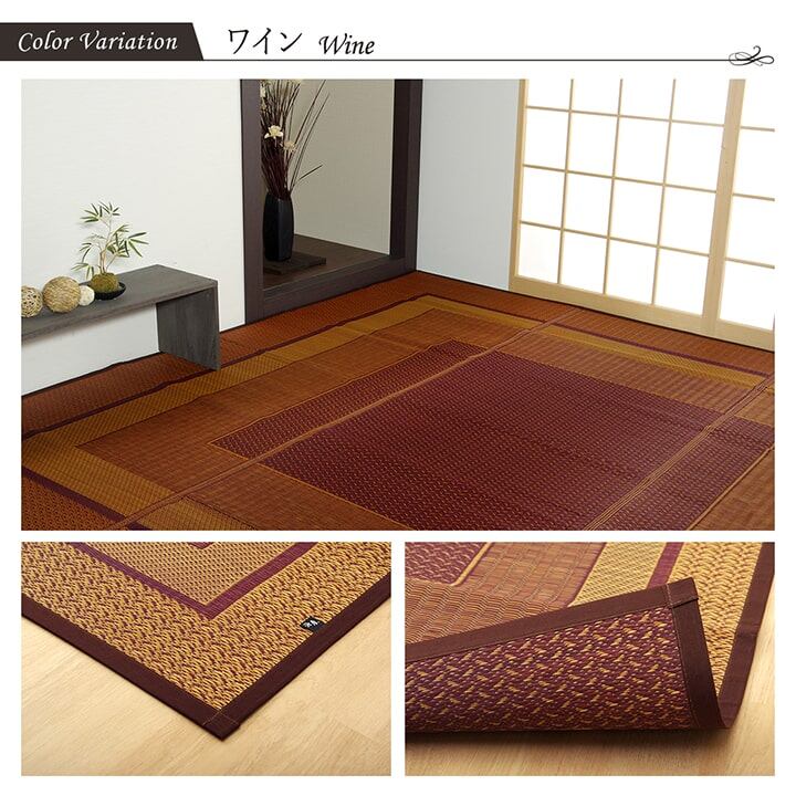 現代のライフスタイルに合う、洗練されたモダンなデザインのイ草カーペットです。国産(九州産)のい草を使用しています。一本一本が太く、表皮が厚く繊維がキメ細かいので弾力性があり、耐久性に優れています。い草には空気の自然浄化作用、湿度の調節作用などがあります。また汚れにくく、使用するうちに黄金色に変化し味が出ます。い草に青森ヒバ加工を施しています。(抗菌、防臭効果)