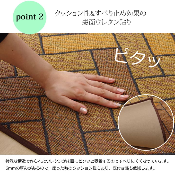 レンガの柄をデザインしたい草ラグカーペットです。フローリングでもご使用できるよう、裏地にはウレタンフォームを使用しているためクッション性のある商品です。洋室にも合いやすいようにシンプルなものにしました。国産(九州産)のい草を使用しています。一本一本が太く、表皮が厚く繊維がキメ細かいので弾力性があり、耐久性に優れています。い草には空気の自然浄化作用、湿度の調節作用などがあります。また汚れにくく、使用するうちに黄金色に変化し味が出ます。い草に青森ヒバ加工を施しています。(抗菌、防臭効果)