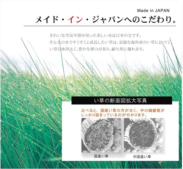シンプルで飽きのこない格子柄のい草カーペットです。国産(九州産)のい草を使用しています。一本一本が太く、表皮が厚く繊維がキメ細かいので弾力性があり、耐久性に優れています。い草には空気の自然浄化作用、湿度の調節作用などがあります。また汚れにくく、使用するうちに黄金色に変化し味が出ます。裏にはウレタンを貼っていますのでフローリングでのご使用にも適しています。い草に青森ヒバ加工を施しています。(抗菌、防臭効果)