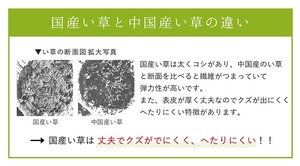 国産(九州産)のい草を使用しています。一本一本が太く、表皮が厚く繊維がキメ細かいので弾力性があり、耐久性に優れています。