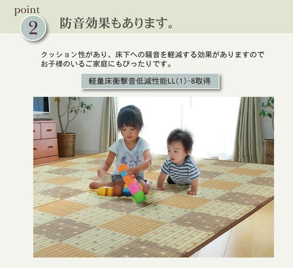 クッション性を追求したボリュームタイプ(メーカー比約3倍)のカーペットです。裏地にはソフトテックというポリエステル素材を使用しています。ポリエステル繊維を、メーカーが新たに開発した独自の技術で圧縮し、通気性を保ちつつ、圧倒的なクッション性をのある素材に仕上げました。軽量床衝撃音低減性能LL(1)-8を取得しており、床下への騒音を軽減する効果もあります。国産(九州産)のい草を使用しています。一本一本が太く、表皮が厚く繊維がキメ細かいので弾力性があり、耐久性に優れています。い草には空気の自然浄化作用、湿度の調節作用などがあります。また汚れにくく、使用するうちに黄金色に変化し味が出ます。い草に青森ヒバ加工を施しています。(抗菌、防臭効果)