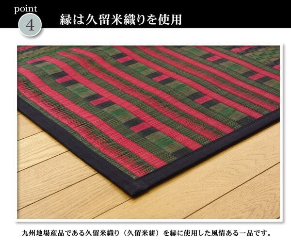 メーカー独自の超特殊な織り方で仕上げた『柳川段通』シリーズのイ草カーペットです。柳川段通の特長として①厳選したイ草を通常の商品よりも約2.2倍(メーカー比)使用しています。②ヘリ生地は久留米織りの生地を使用しています。久留米織りとは福岡県久留米地方の伝統的な織りもので、着物や洋服によく使われている貴重な織りものです。③本商品の織り職人はこの道一筋20年〜40年の熟練の匠です。柄の特長として『和室・洋室どちらにも似合う敷きやすい段通』をコンセプトに作りました。永くご使用頂きたいので飽きのこない格子柄で、細部にはドットやボカシといった変化を持たせたデザインに仕上げています。さらに本商品は四重に織ることで耐久性、ボリューム感、圧倒的な存在感のある商品に仕上げました。国産(九州産)のい草を使用しています。一本一本が太く、表皮が厚く繊維がキメ細かいので弾力性があり、耐久性に優れています。い草には空気の自然浄化作用、湿度の調節作用などがあります。また汚れにくく、使用するうちに黄金色に変化し味が出ます。い草に青森ヒバ加工を施しています。(抗菌、防臭効果)