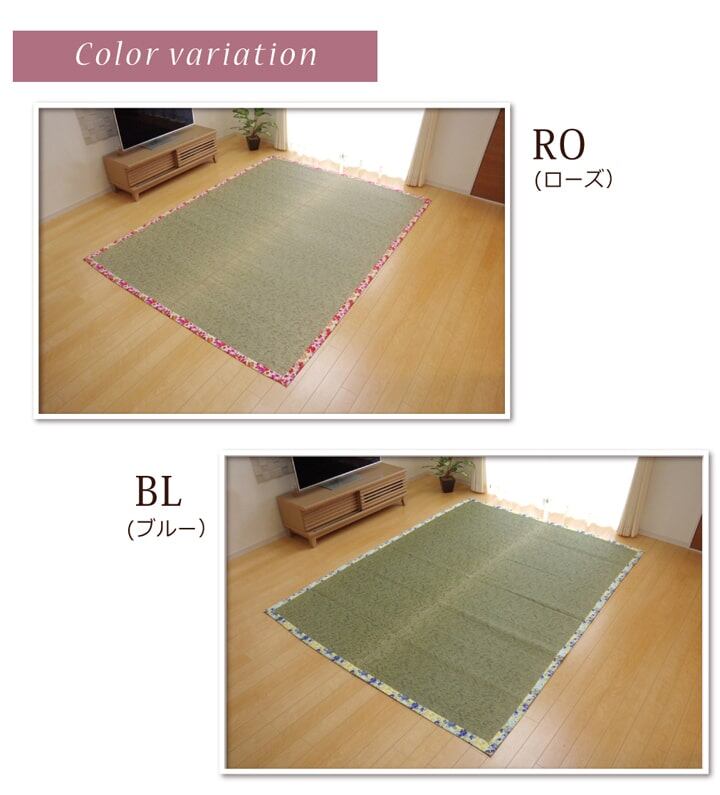 花柄のヘリを用いたい草ラグです。女性らしさ、春らしさを表現した商品です。裏面には滑りにくい加工をした不織布を使用しているため、フローリングにも最適です。い草には空気の自然浄化作用、湿度の調節作用などがあります。い草に青森ヒバ加工を施しています。(抗菌、防臭効果)