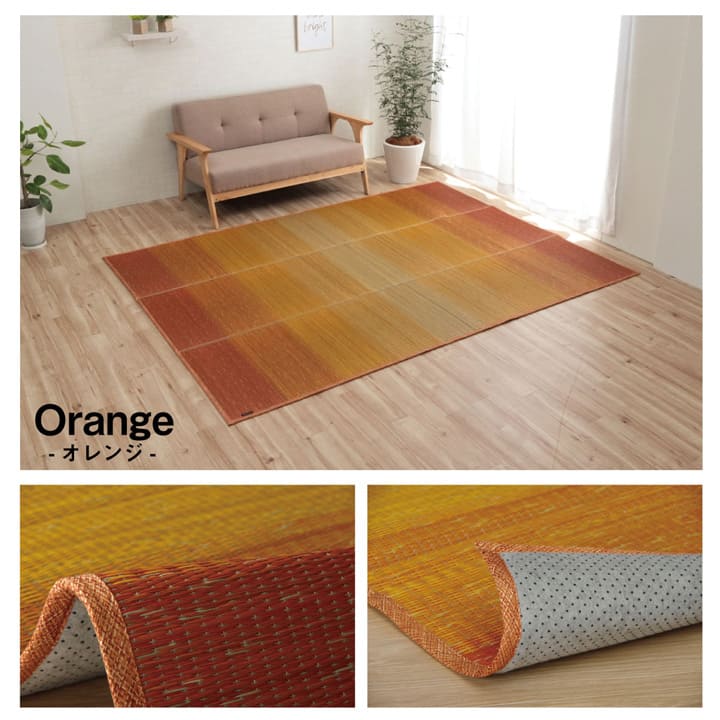 KOBA-GUARDという吹き付け加工をおこなったい草ラグです。KOBA-GUARD加工により制菌・抗菌防臭があります。グラデーションカラーでお部屋の彩と清潔感をプラスしてくれます。裏は滑り止め不織布付きで床を傷つけません。