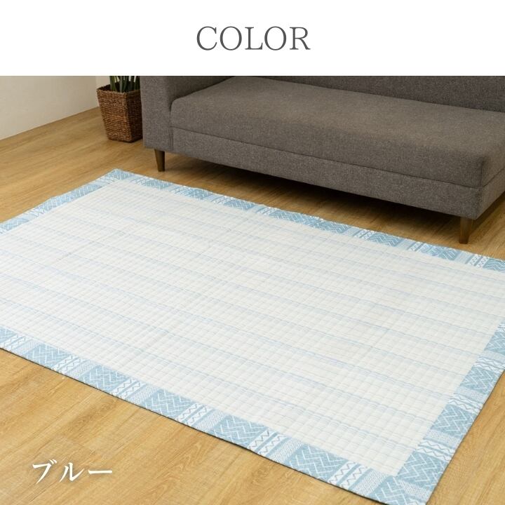 中綿量が1.5倍のボリュームタイプ。キルト幅も2インチタイプ。表地綿100%。中心部分のしじらはシャキッとさわやか。さらっとしていて夏に最適。凹凸感があり肌離れ◎。額部分は北欧テーストを採用し明るい雰囲気を出した商品です。柄に垂直にキルトを入れるこだわりの製法を採用して見た目にもすっきりとした商品に仕上げています。裏素材は強度のあるポリエステル不織布を採用。すべりにくい加工をしているのでフローリングでも使用しやすい商品です。約1畳サイズでソファー前やベッド横などに最適。敷きパッドとしても使用できるサイズです。