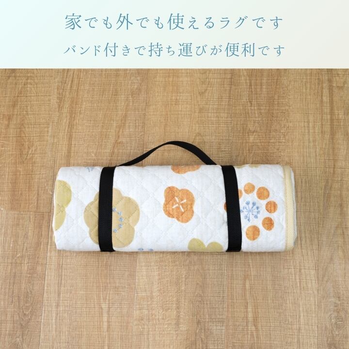 一年中、家でも外でも使うことができる防水ラグです。バンド付きですので持ち運びに便利です。