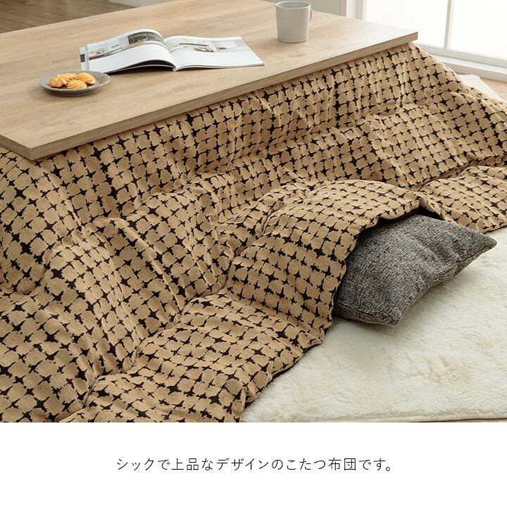 シックで上品なデザインのこたつ布団です。表地にはシェニール糸を使用した生地を使用しています。裏地には肌触りが良いマイクロファイバーを使用しています。中綿には弾力性と保温性の高い東レマッシュロン綿を使用しているため軽くて暖かいです。部分暖房のこたつは電気代もおトクです。