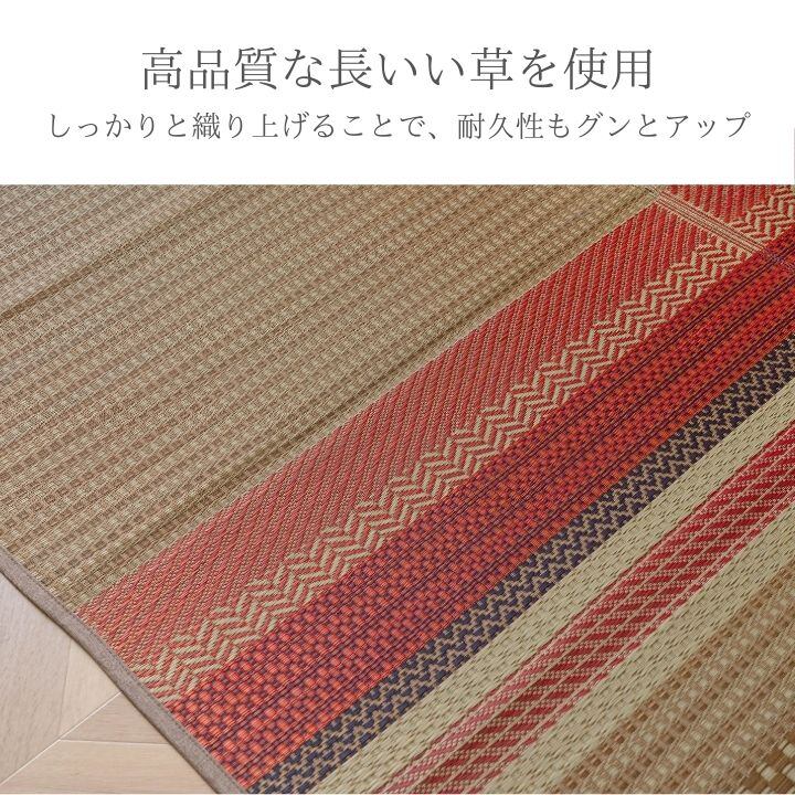 い草の中でも特に高品質な長いい草を使用し、しっかりと織り上げることで、耐久性もグンとアップしたつくりになっています。裏面には滑りにくい加工を施しているので、ずれにくくて安心です。制菌、抗菌防臭、消臭効果があります。