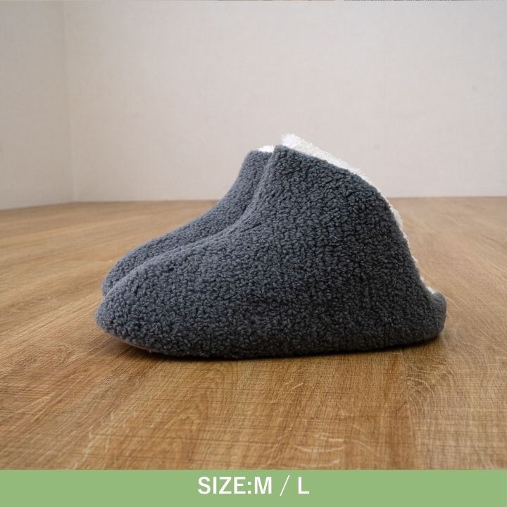 表生地はふわふわ生地、内側はあったかいファーで作成しています。すっぽりハマって履きやすく、脱ぎやすい形です。