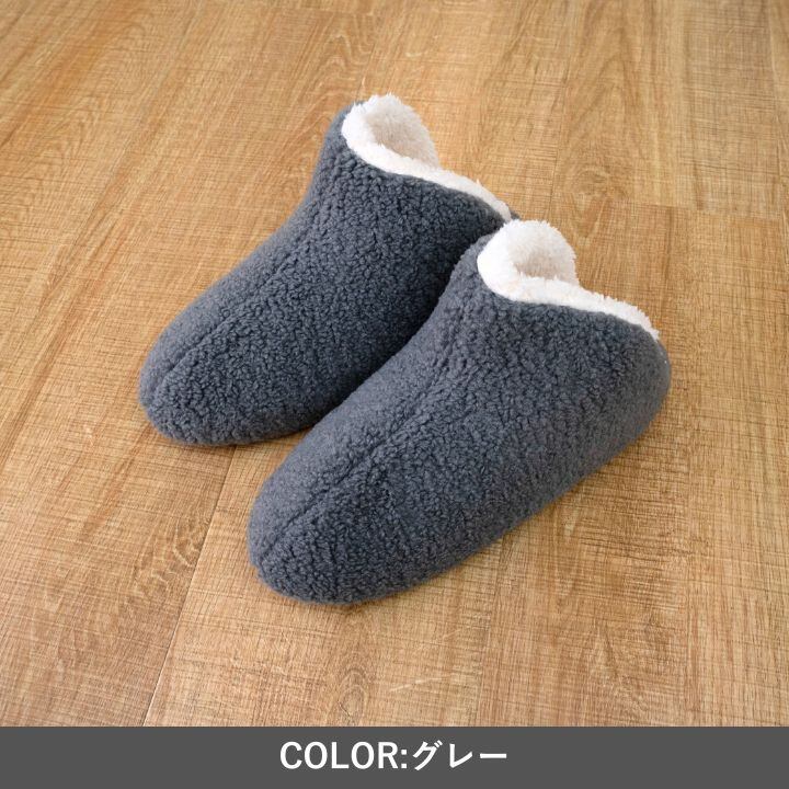 表生地はふわふわ生地、内側はあったかいファーで作成しています。すっぽりハマって履きやすく、脱ぎやすい形です。