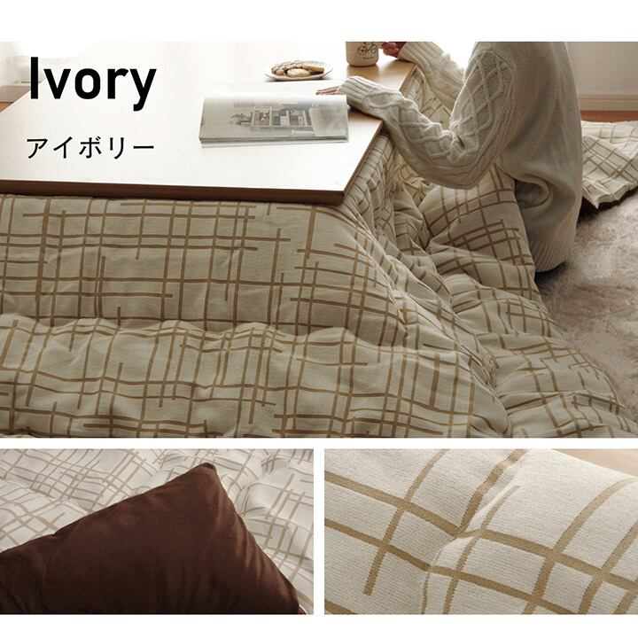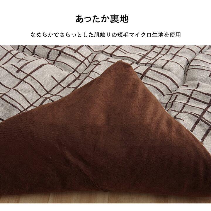ナチュラルテイストでシンプルに仕上げ、現代の家具にも合わせやすいこたつ布団。表地はシェニール織りの暖かみある凹凸感ある生地を使用し、裏地にはなめらかな肌触りの短毛マイクロ生地を使用しています。たっぷり入った東レマッシュロン綿がふかふかとした弾力性と保温性を高め、「軽くて暖かい」を実現しました。ふっくらとしたボリューム感は国内で綿入加工をしている商品だからできる仕上がり。1枚1枚丁寧に仕上げた安心の品質です。