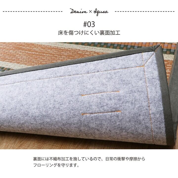 広島県福山市のデニム生地メーカー、カイハラ株式会社の生地をヘリで使いました。イ草生地は袋織りという技法で繊細な柄を出しています。折れ曲がりが複雑なので長いイ草を使用しないと切れてしまいます。縦糸が密なので、しっかりとして破れにくいのが特徴です。国産(九州産)のい草を使用しています。一本一本が太く、表皮が厚く繊維がキメ細かいので弾力性があり、耐久性に優れています。い草には空気の自然浄化作用、湿度の調節作用などがあります。裏にはフローリングを傷つけにくいよう、不織布を貼っています。い草に青森ヒバ加工を施しています。(抗菌、防臭効果)
