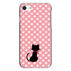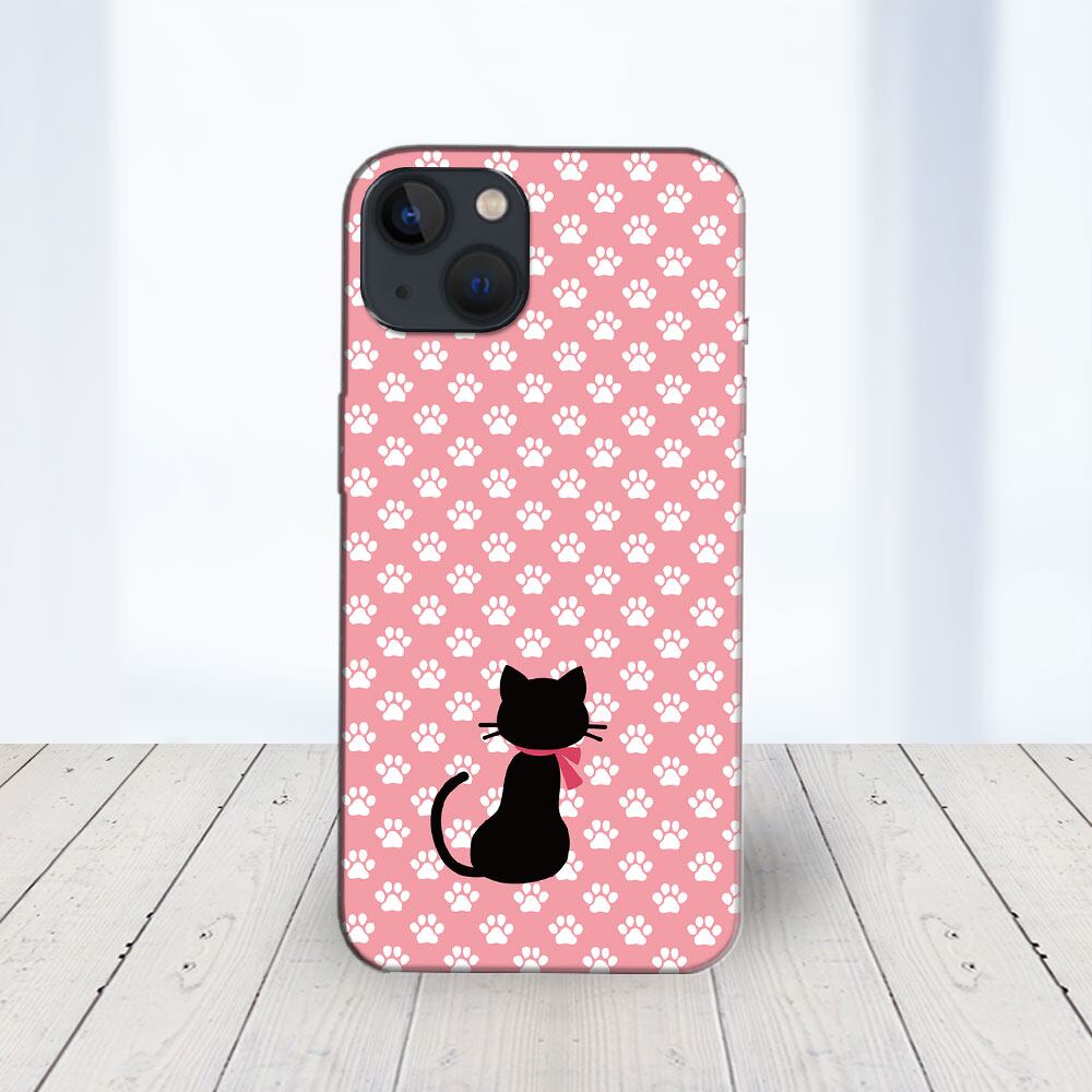 iPhone対応 スマホ ハードケース クリア 黒ネコと足跡-ピンクD 猫 ドット 【iPhone17 / iPhone16e / AQUOS / Xperia 他 iPhone / Android ほぼ全機種対応】 |ctftd021