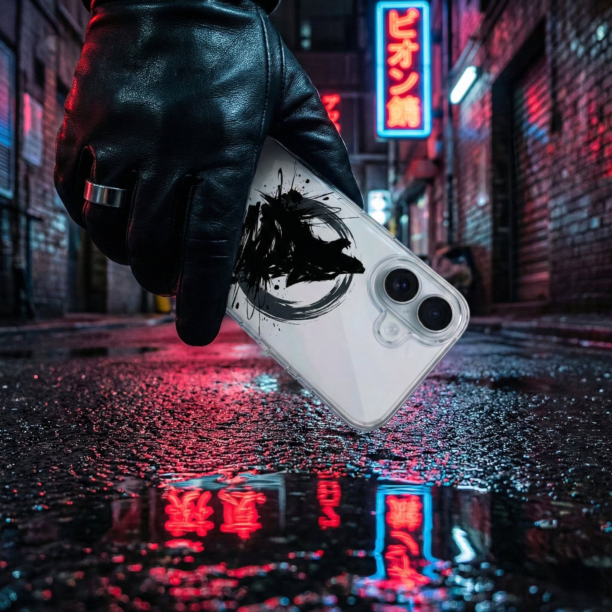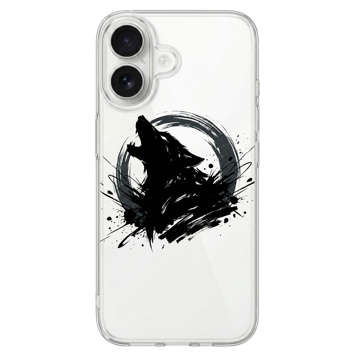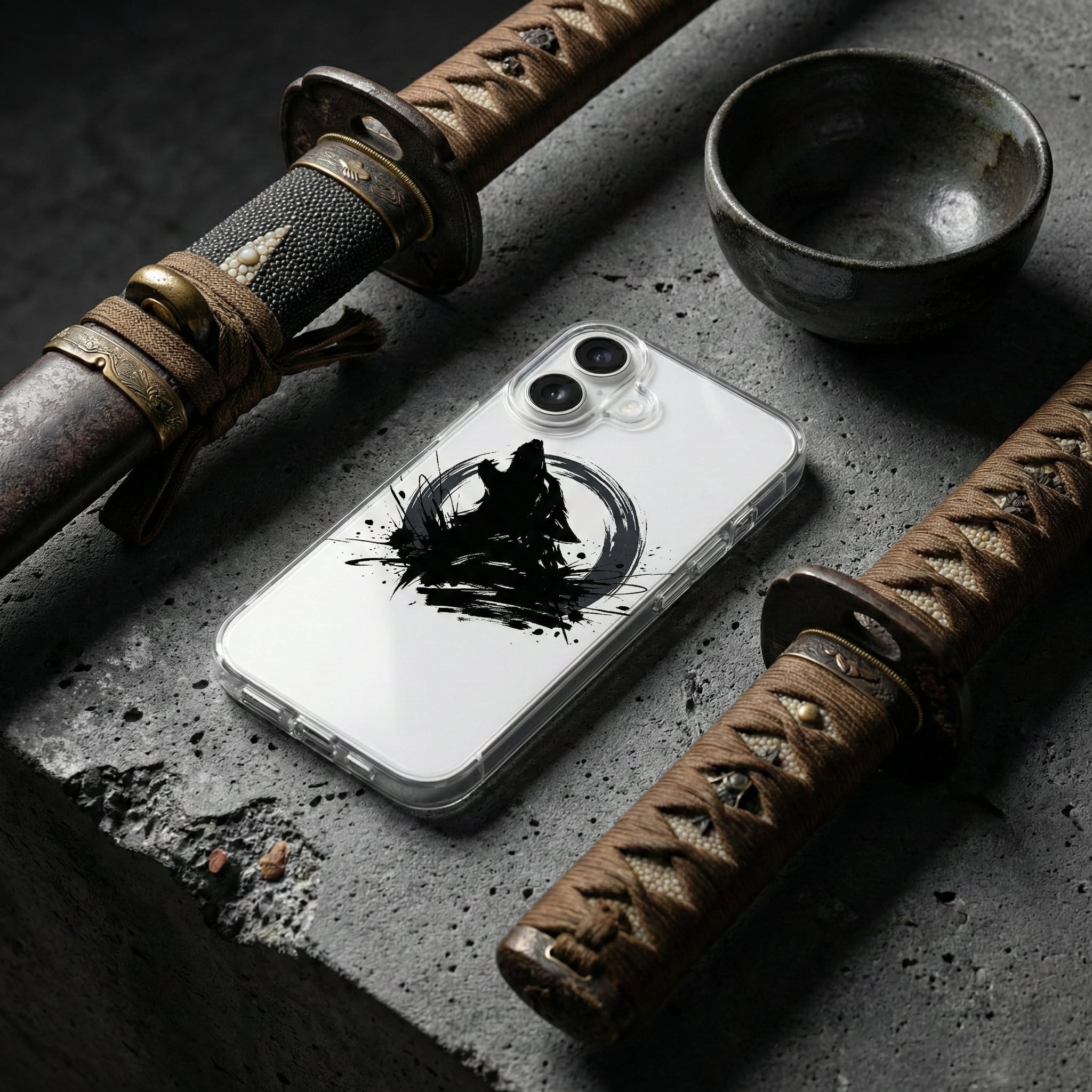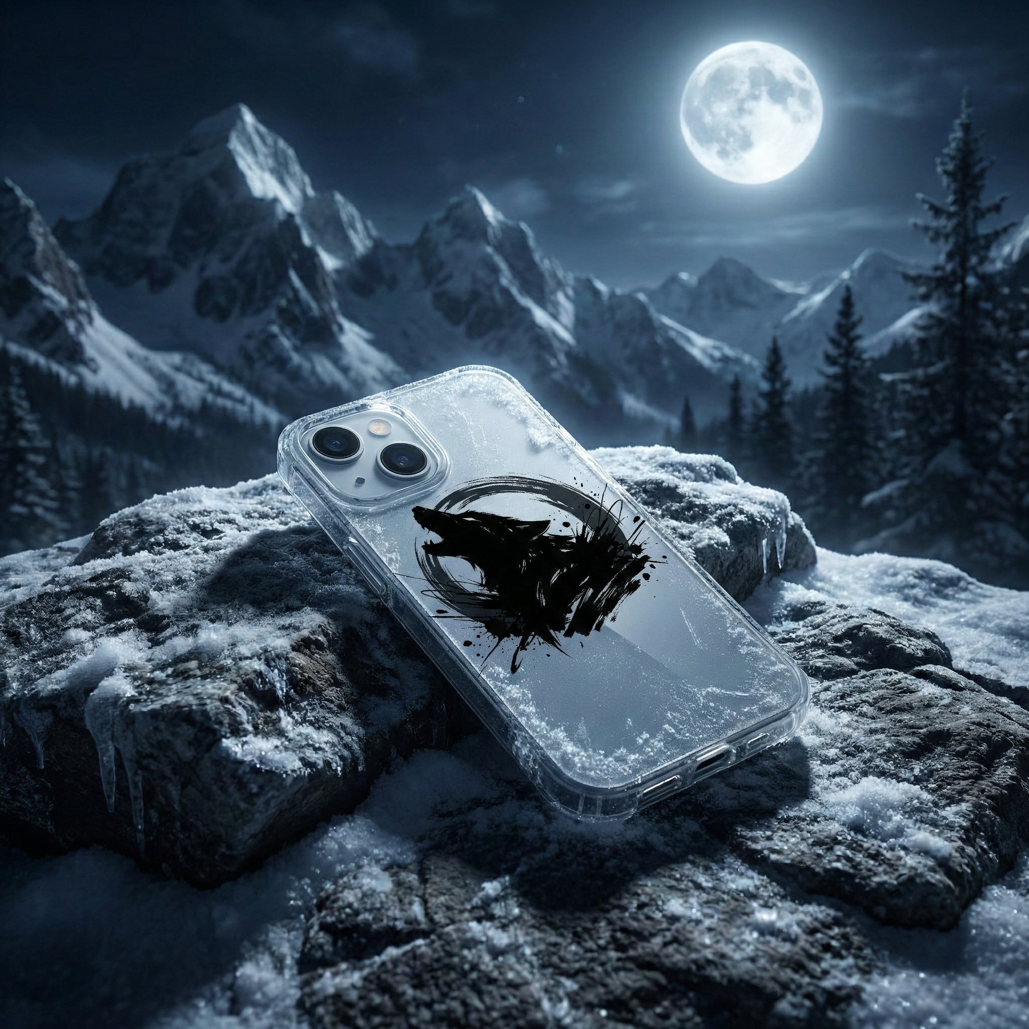 闇夜に吠える狼を、躍動感あふれる筆文字アートで表現。クリアケースが端末本来のカラーを活かしつつ、黒いシルエットが鋭い存在感を放ちます。国境や文化の枠を超えた、ミステリアスで野性的な魅力をその手に。