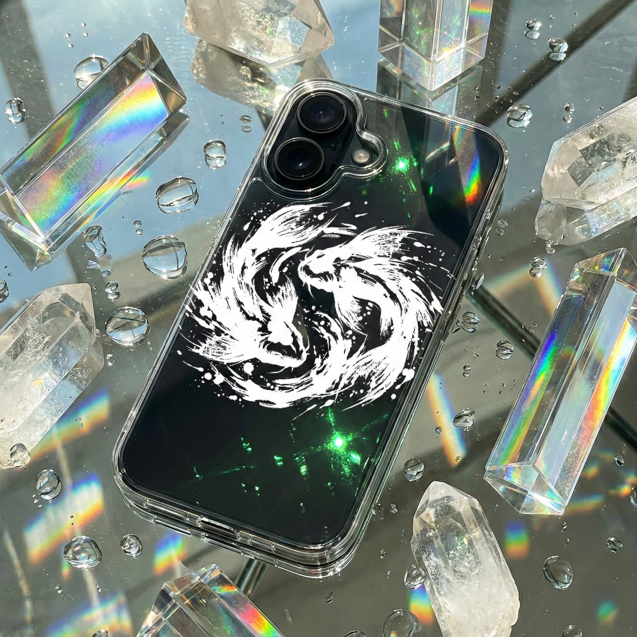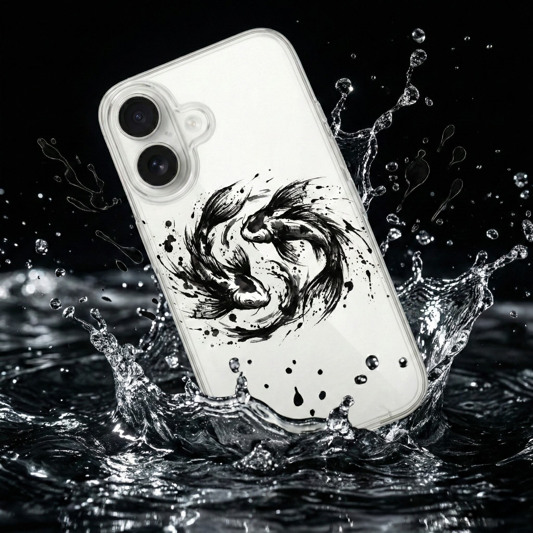 激しく水しぶきを上げる鯉の姿を、鋭い筆致のシルエットで表現。静寂と動乱が同居する「禅」の精神を、モダンでワイルドなスタイルに落とし込みました。持つ人の内なる強さを引き出す、深淵なジャパニーズ・アート。