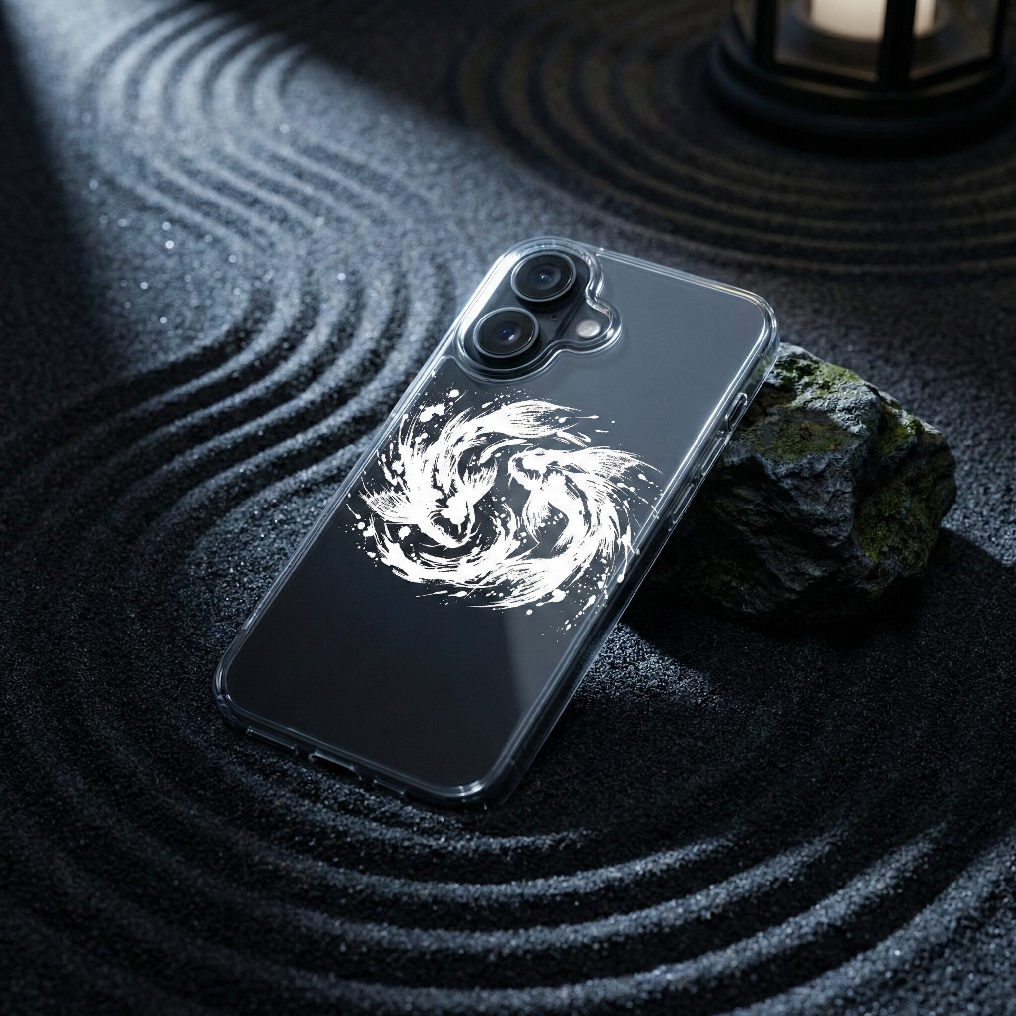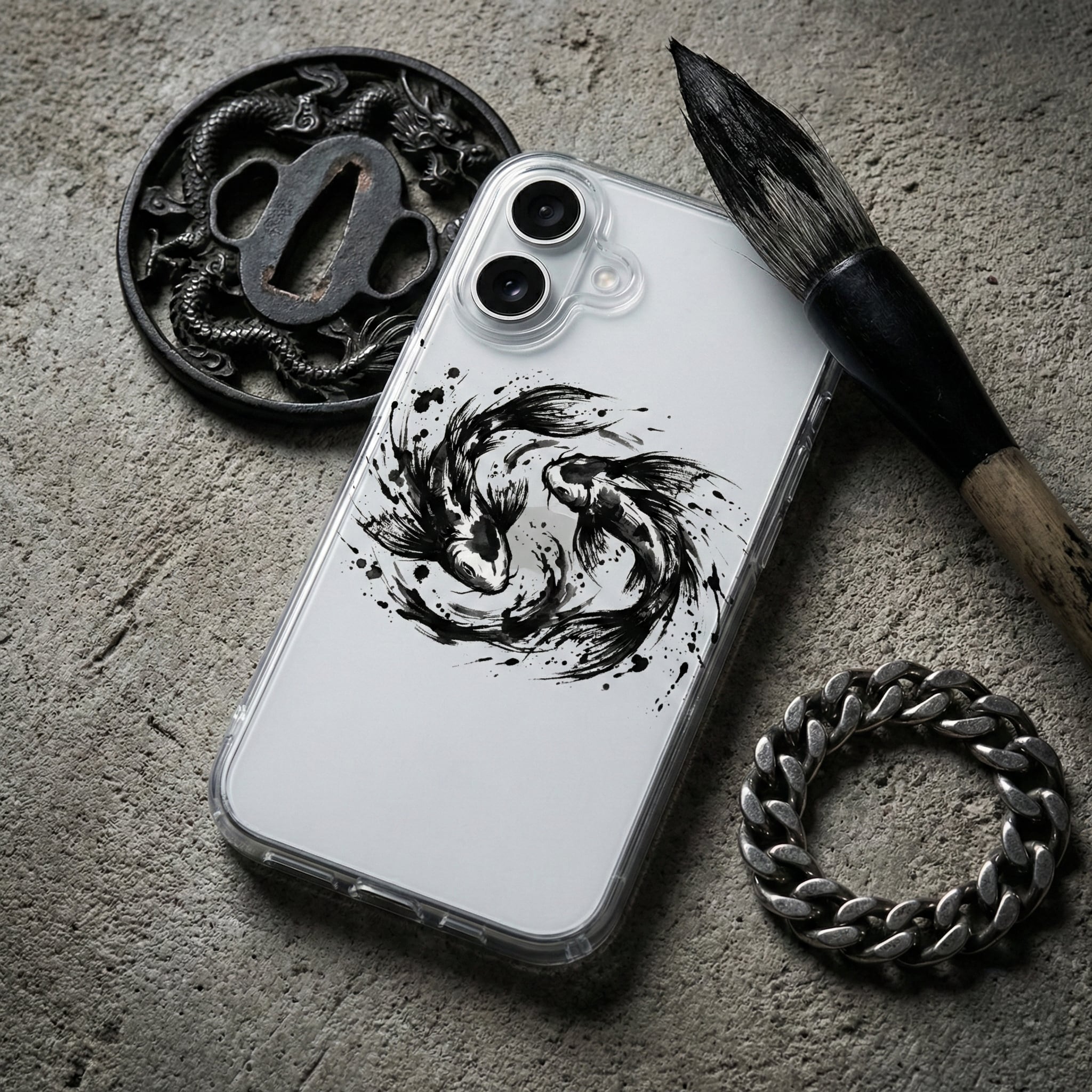 iPhone対応 スマホ ハードケース クリア シルエット 錦鯉 水墨画 ブラック ホワイト 魚 ワンポイント Sumi-e Silhouette Art シースルー 【iPhone17 / iPhone16e / AQUOS / Xperia 他 iPhone / Android ほぼ全機種対応】 |iajpnk01
