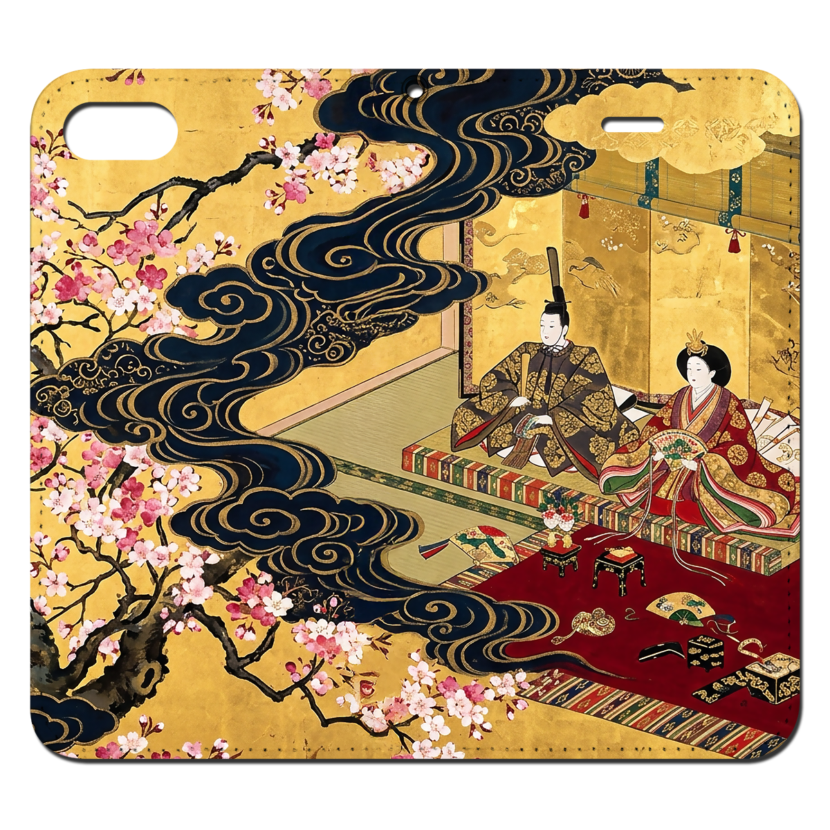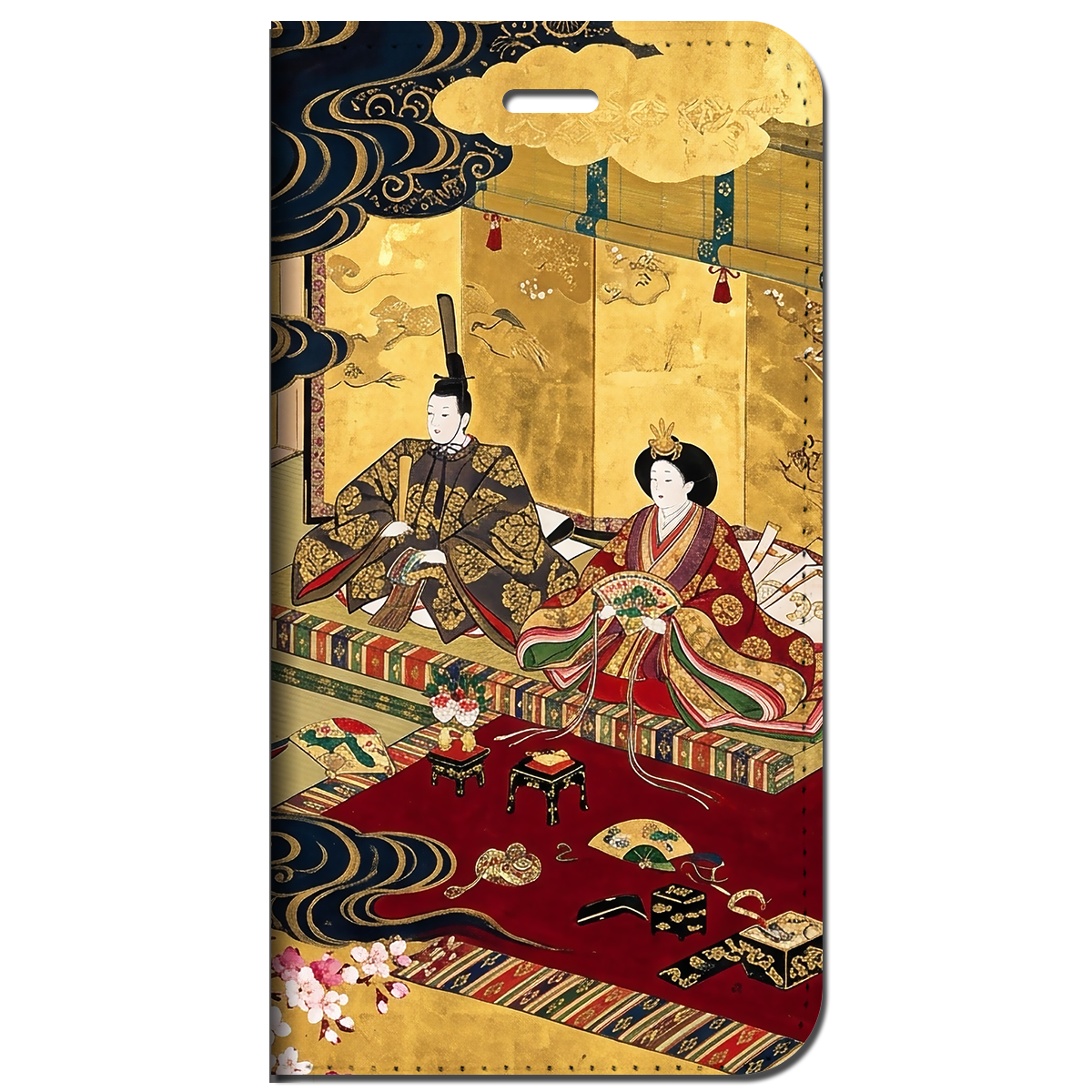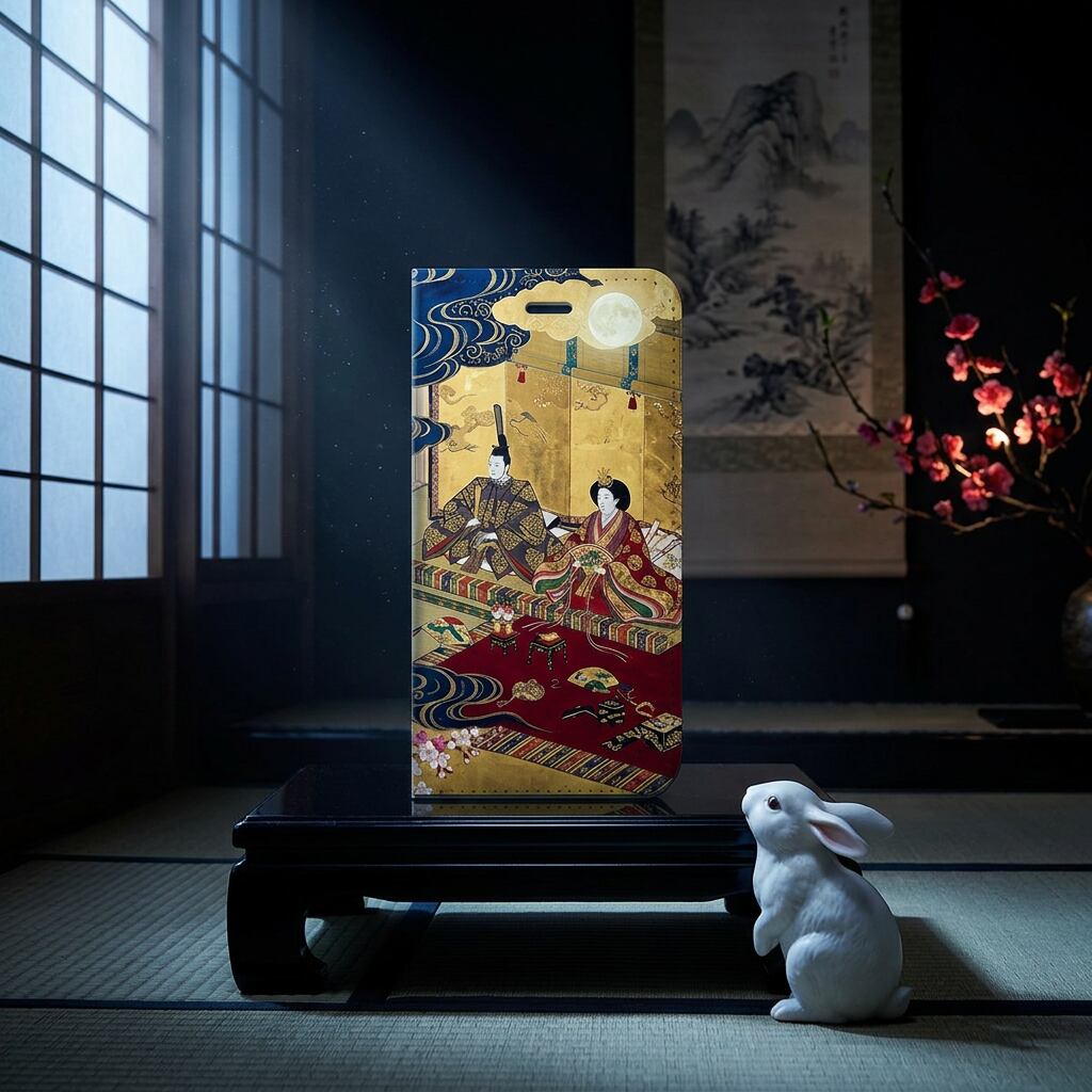 豪華な金箔の背景に、深紅が映える美しいお雛様。浮世絵の美学を、現代的なアレンジで表現しました。日本古来の雅な世界観を日常に持ち歩ける、海外の方からも愛される洗練されたデザインです。