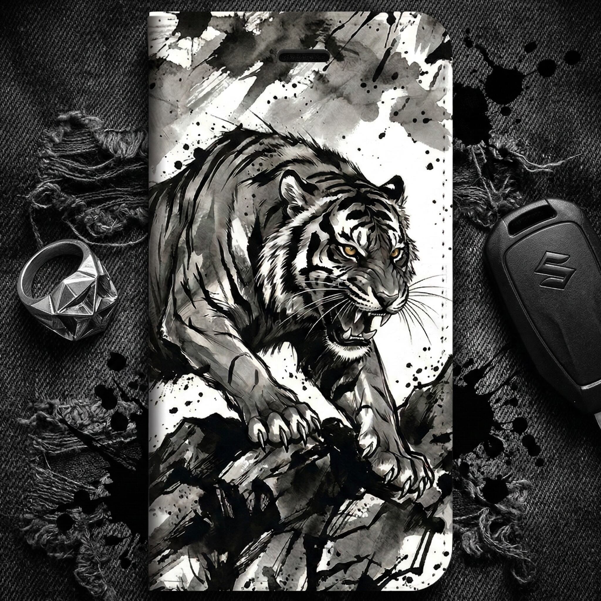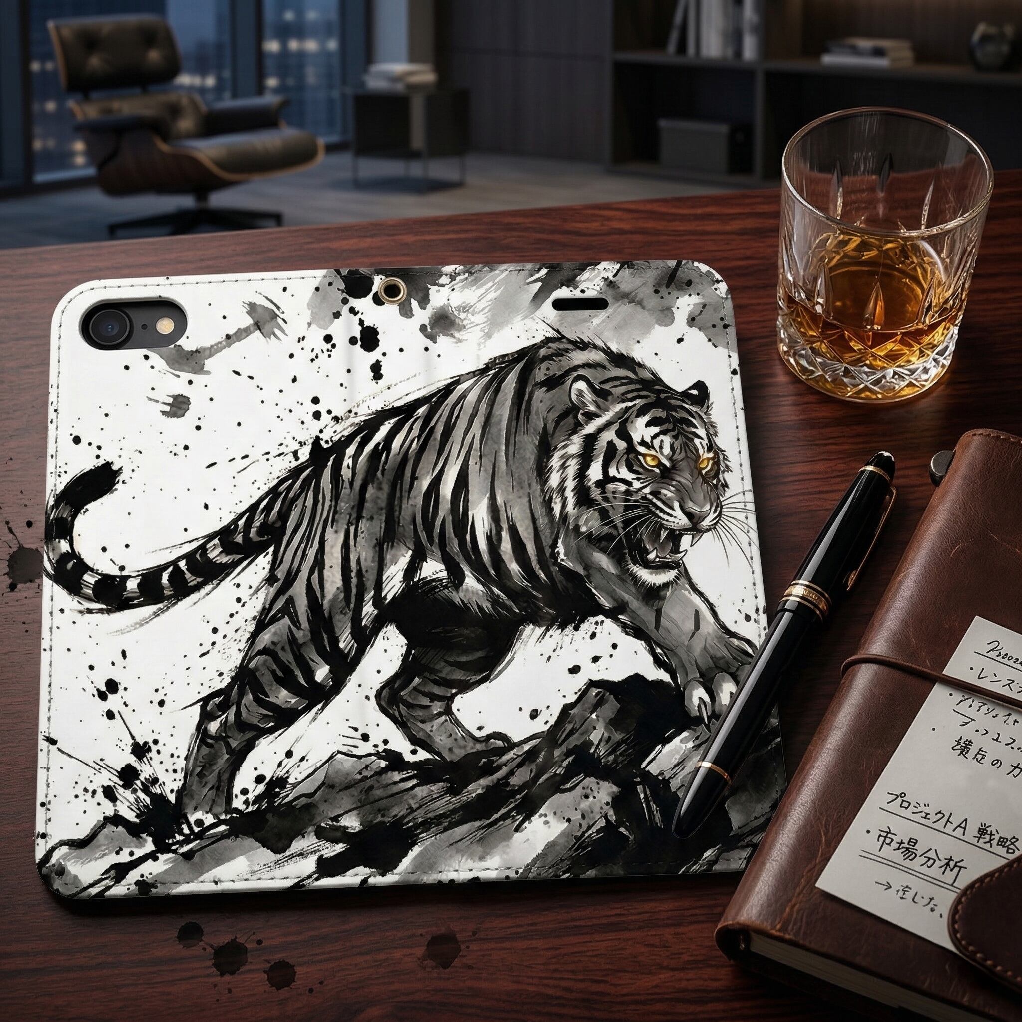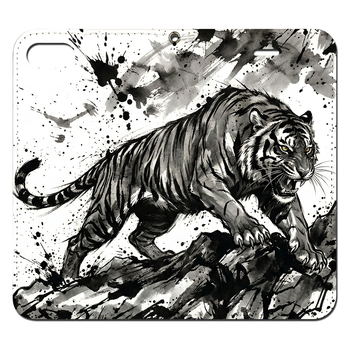 荒々しい筆致と飛び散る墨の飛沫が目を惹く、大迫力の「墨絵の虎」デザイン。咆哮する虎の力強さを、あえてモノトーンの水墨画で表現することで、派手すぎない「渋くて知的なワルさ」を演出。大人の男の心をくすぐる手帳型ケースです。