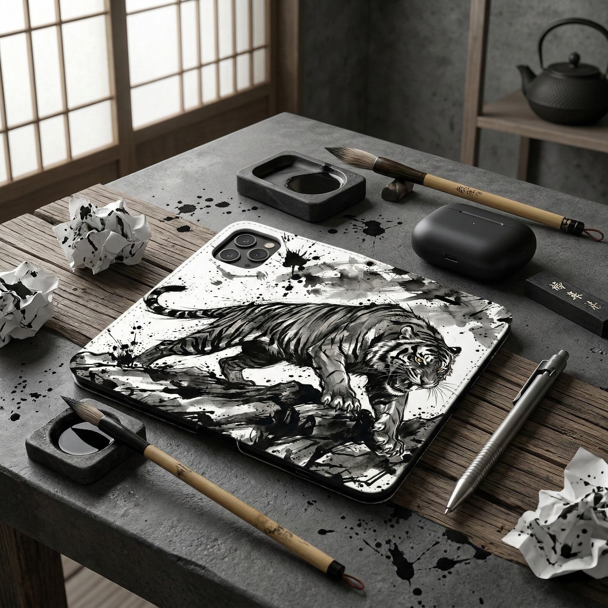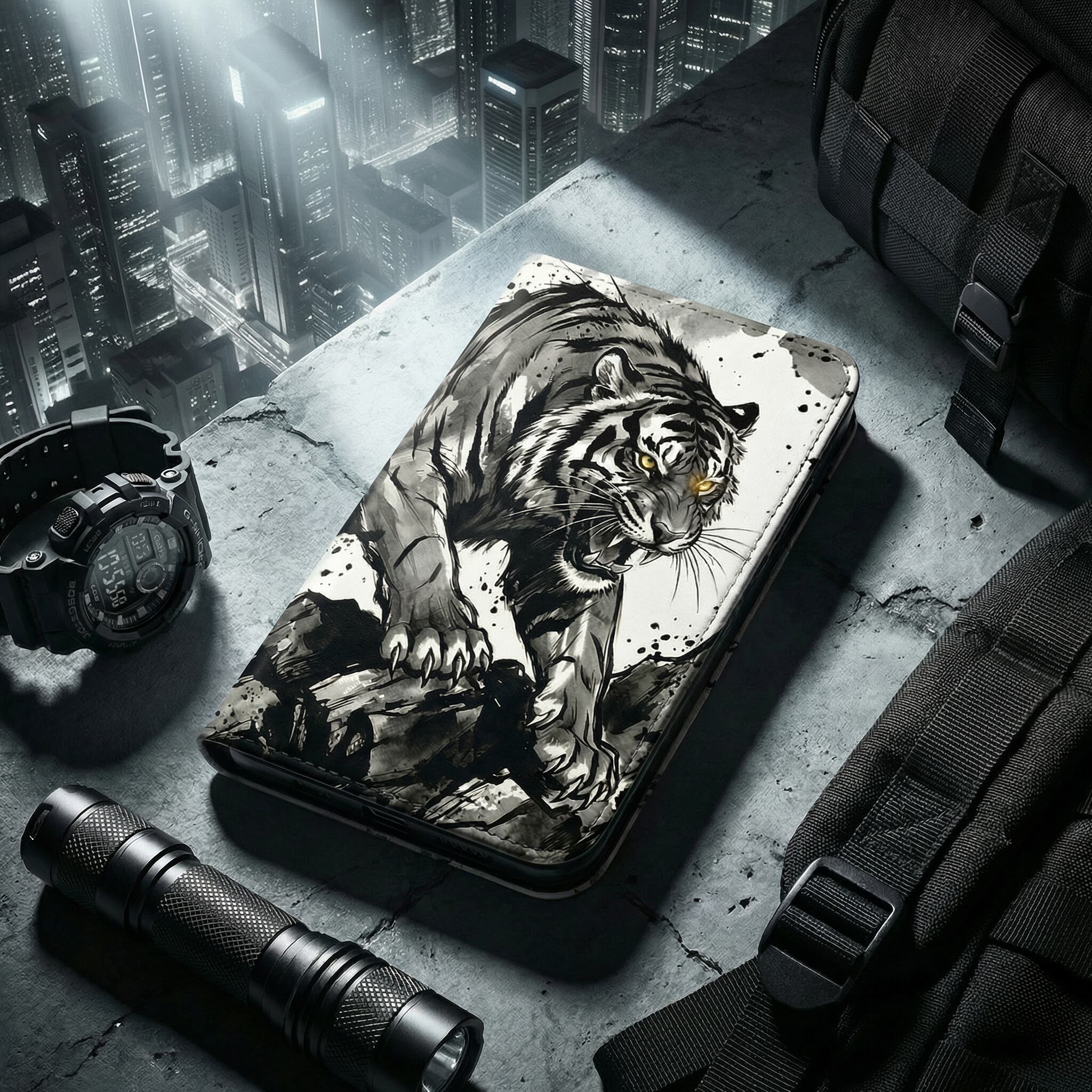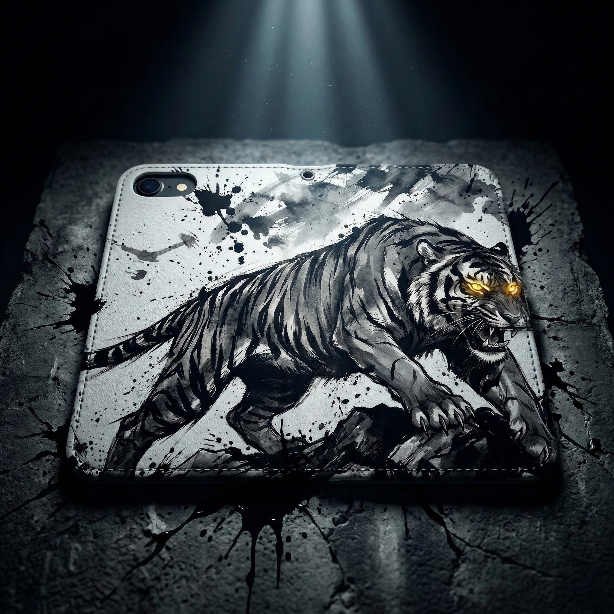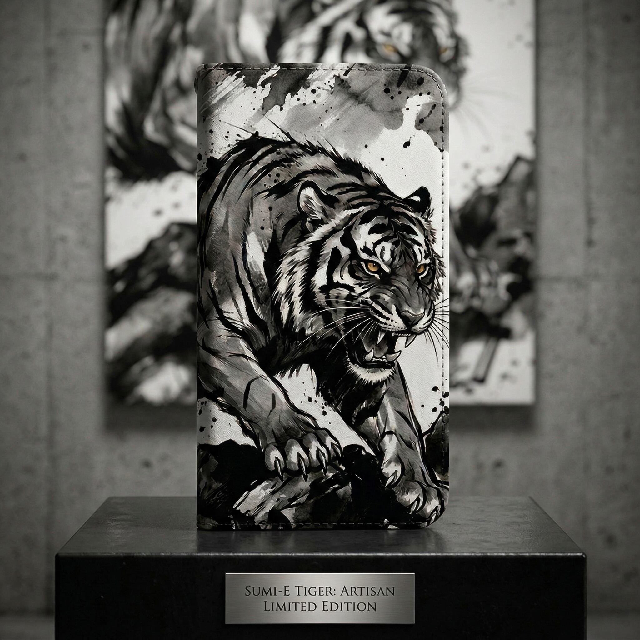 荒々しい筆致と飛び散る墨の飛沫が目を惹く、大迫力の「墨絵の虎」デザイン。咆哮する虎の力強さを、あえてモノトーンの水墨画で表現することで、派手すぎない「渋くて知的なワルさ」を演出。大人の男の心をくすぐる手帳型ケースです。