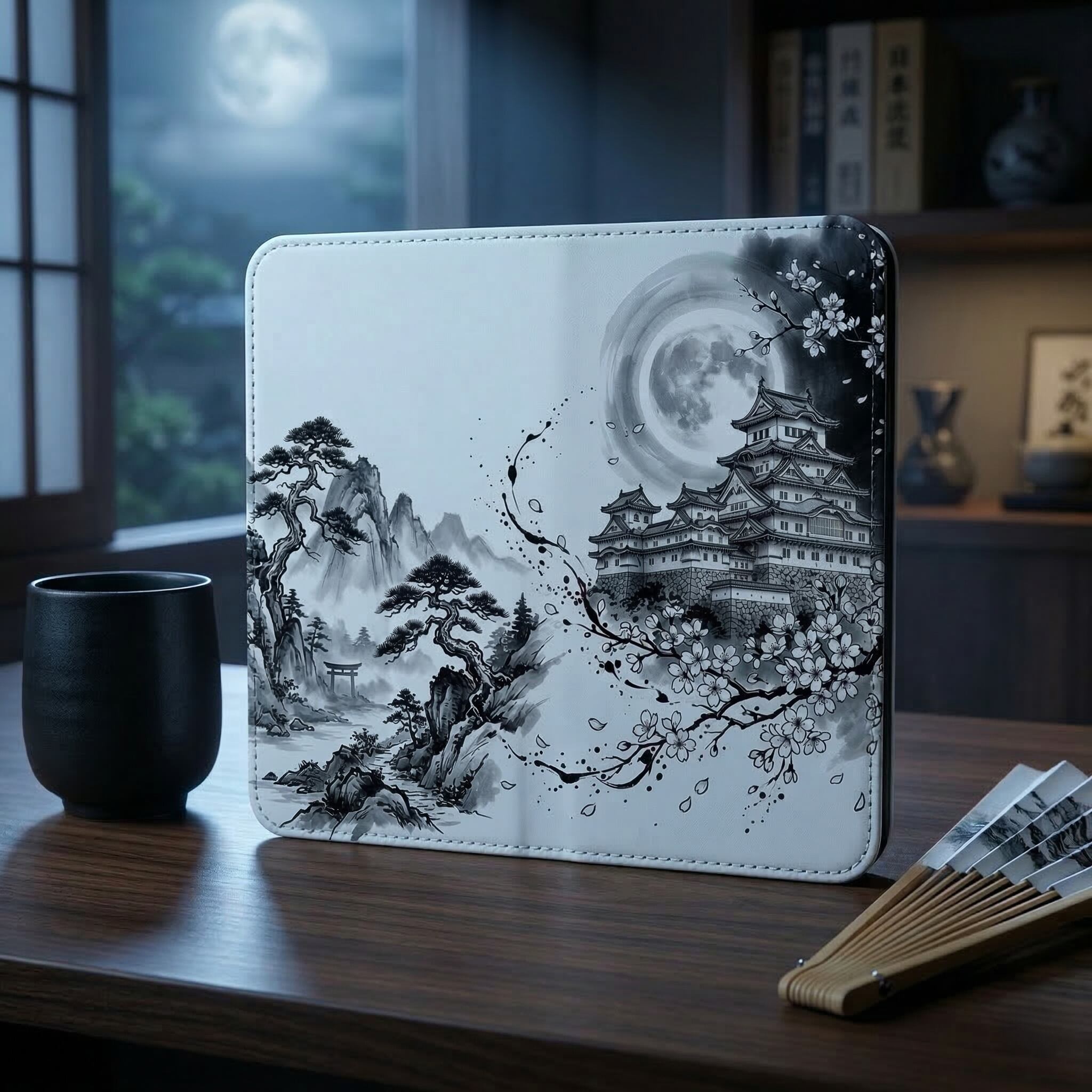 Step into a world of historical romance with this exquisite Sumi-e (Japanese ink wash painting) design. Featuring a majestic traditional castle illuminated by a full moon and surrounded by gently falling cherry blossoms, this artwork captures the profound beauty and serenity of ancient Japan. Blending classic aesthetics with modern minimalism, it brings a touch of refined "Iki" (chic) to the palm of your hand, perfect for history enthusiasts and lovers of Japanese culture.