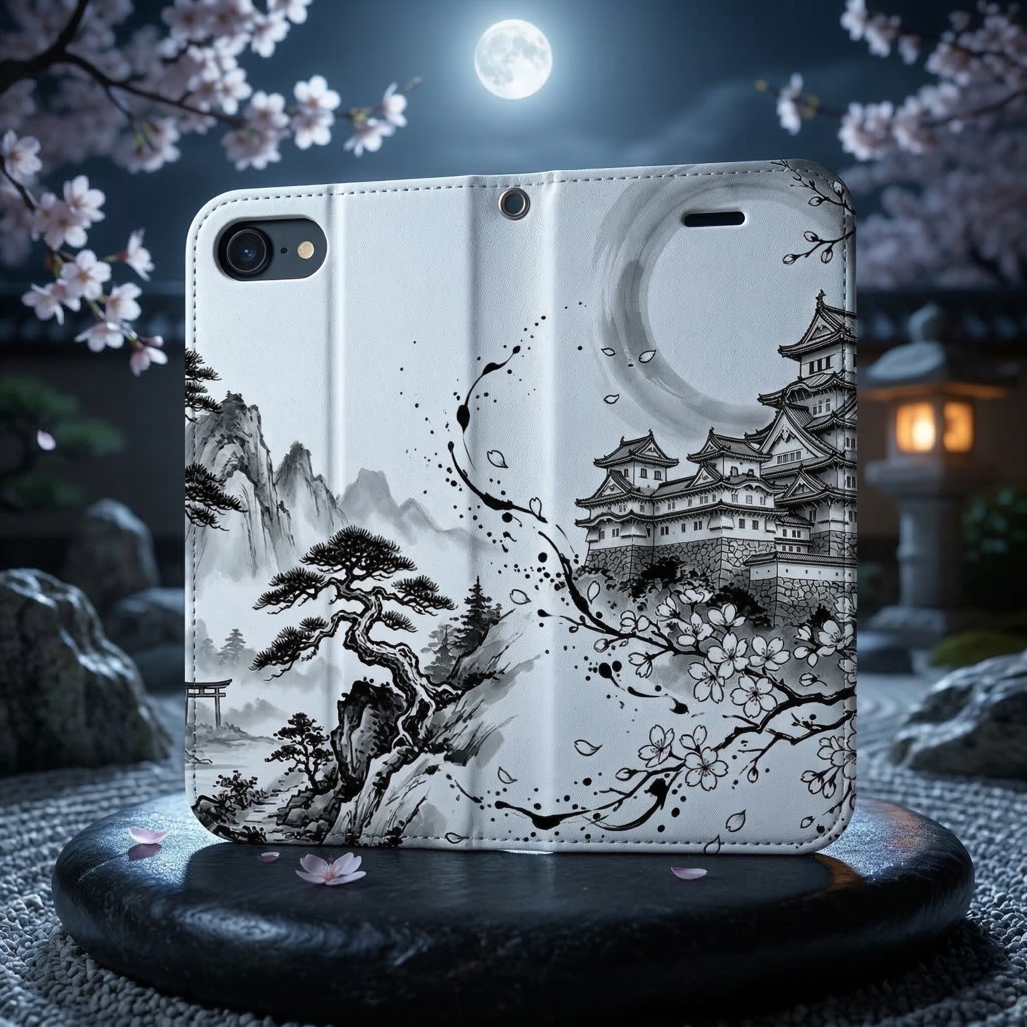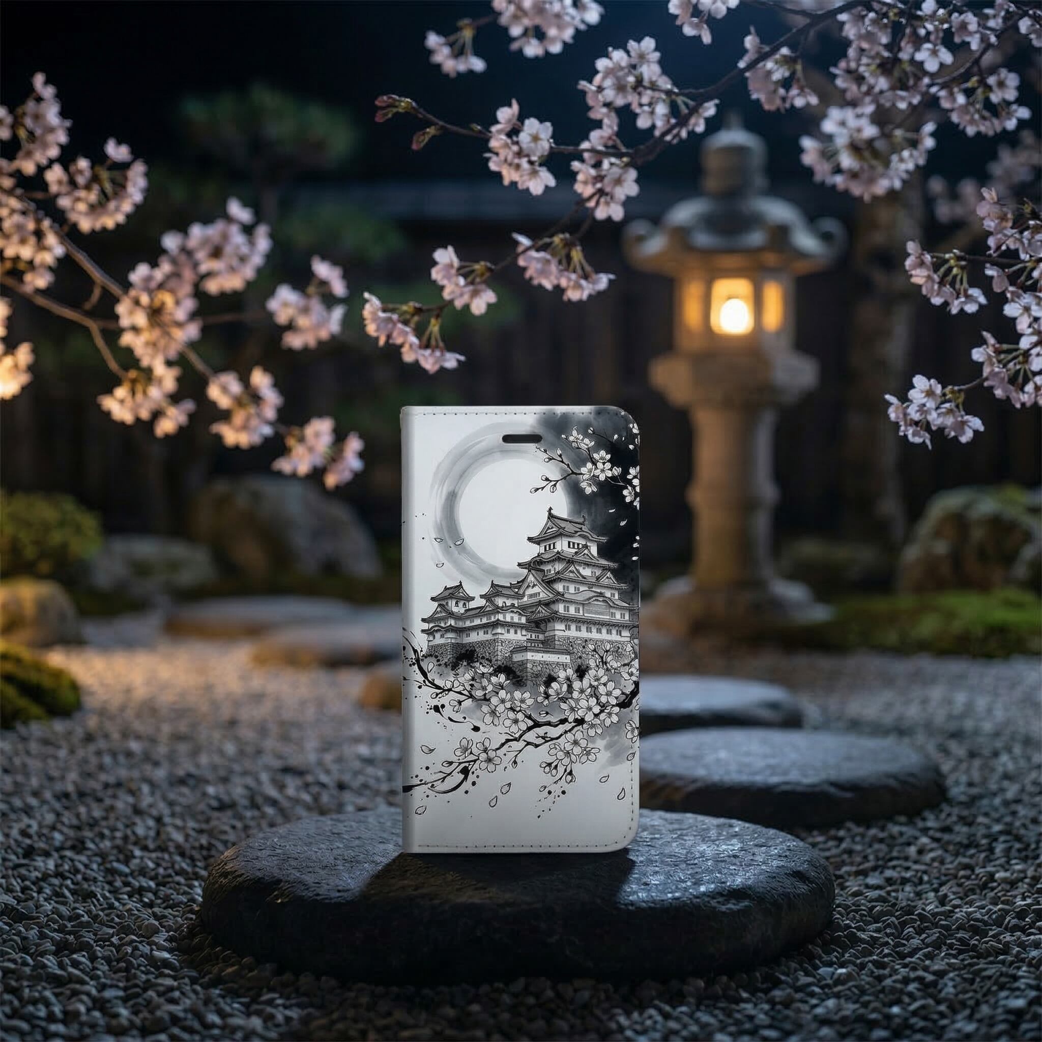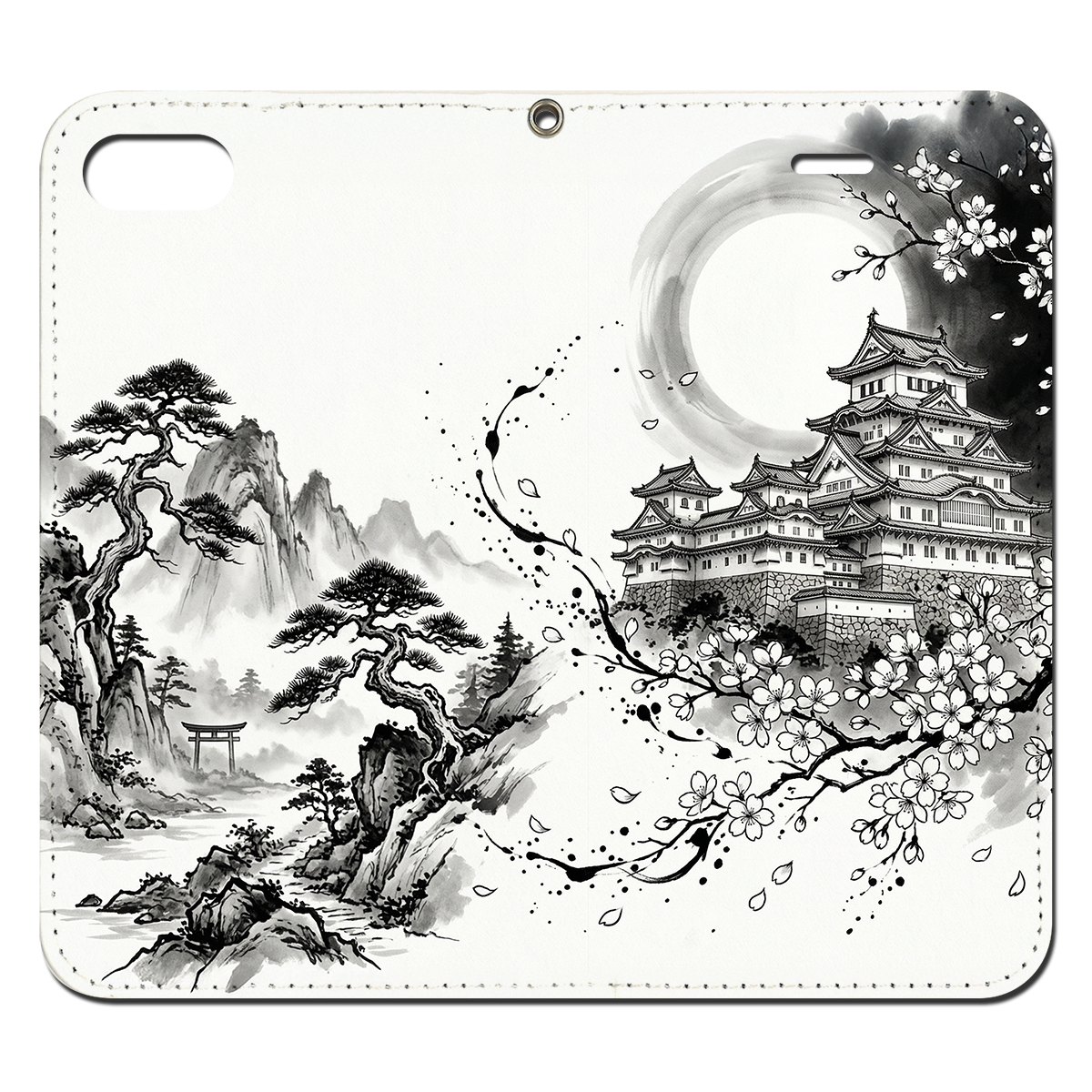 iPhone対応 スマホ 手帳型ケース 墨絵 城 桜 満月 日本 風景 城 桜 満月 和風 和柄 伝統美 山水画 和モダン Sumi-e Silhouette Art 【iPhone17 / iPhone16e / iPhone16 他 iPhone各機種対応】 |iajpcs01