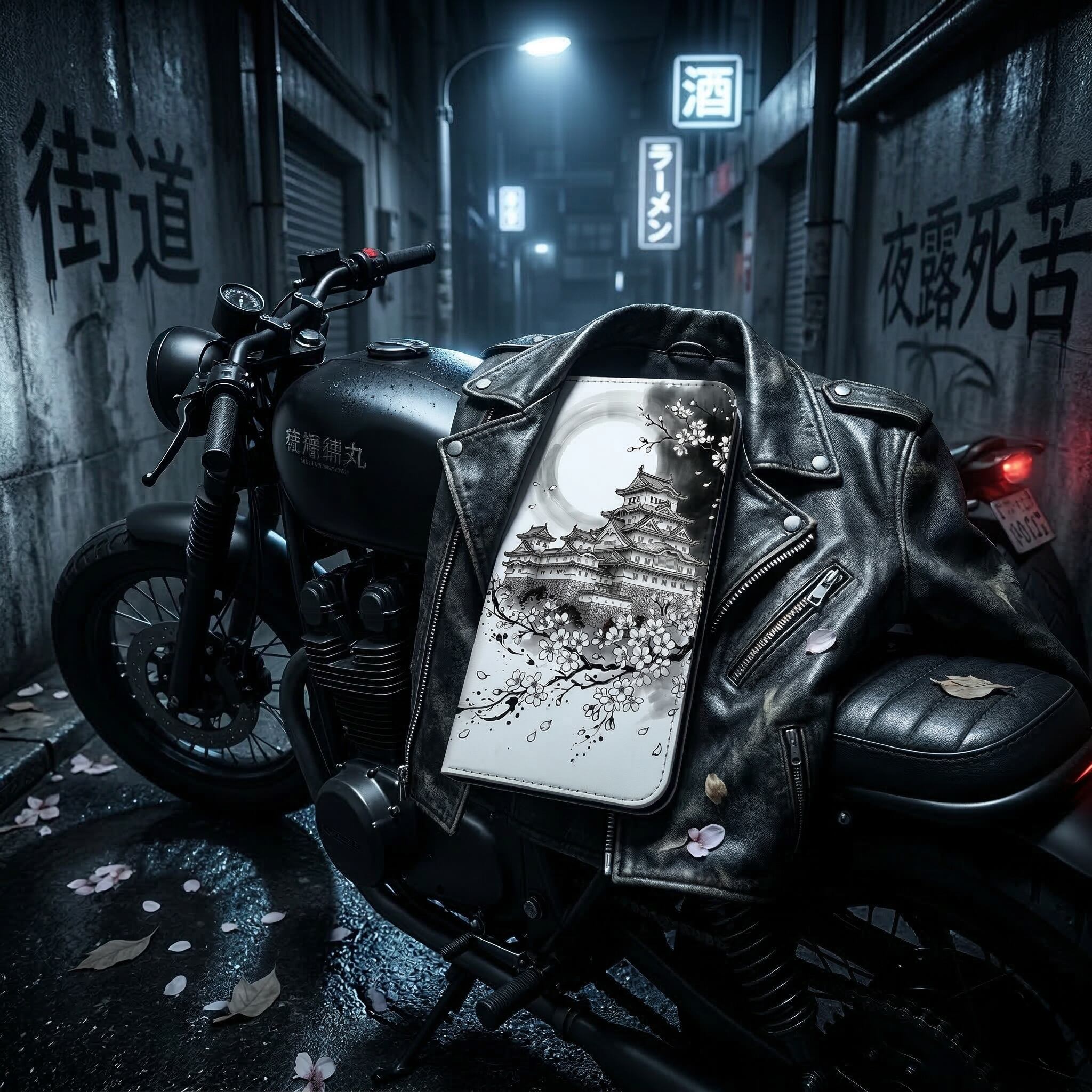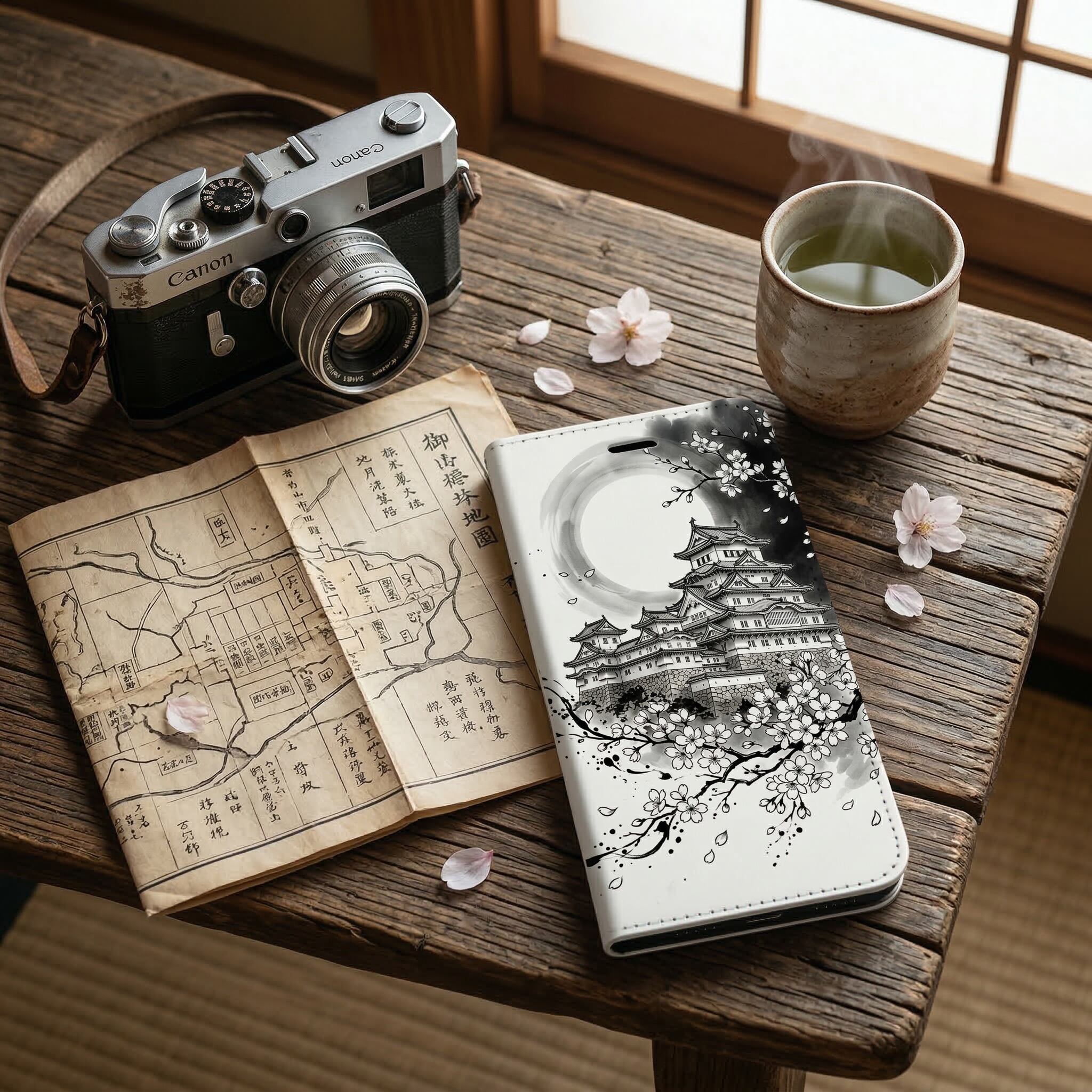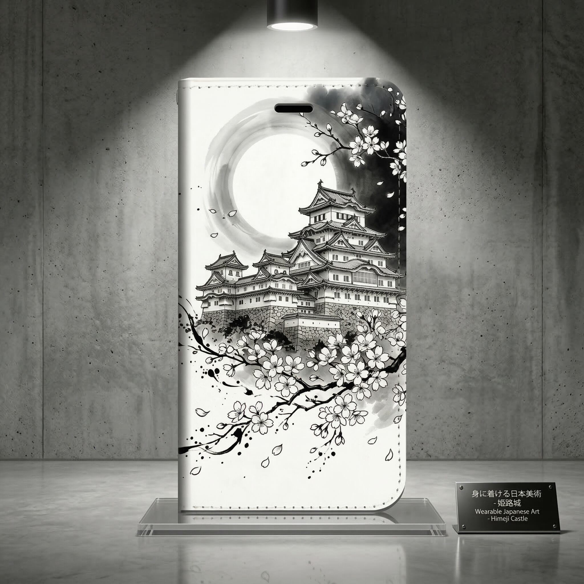 iPhone対応 スマホ 手帳型ケース 墨絵 城 桜 満月 日本 風景 城 桜 満月 和風 和柄 伝統美 山水画 和モダン Sumi-e Silhouette Art 【iPhone17 / iPhone16e / iPhone16 他 iPhone各機種対応】 |iajpcs01
