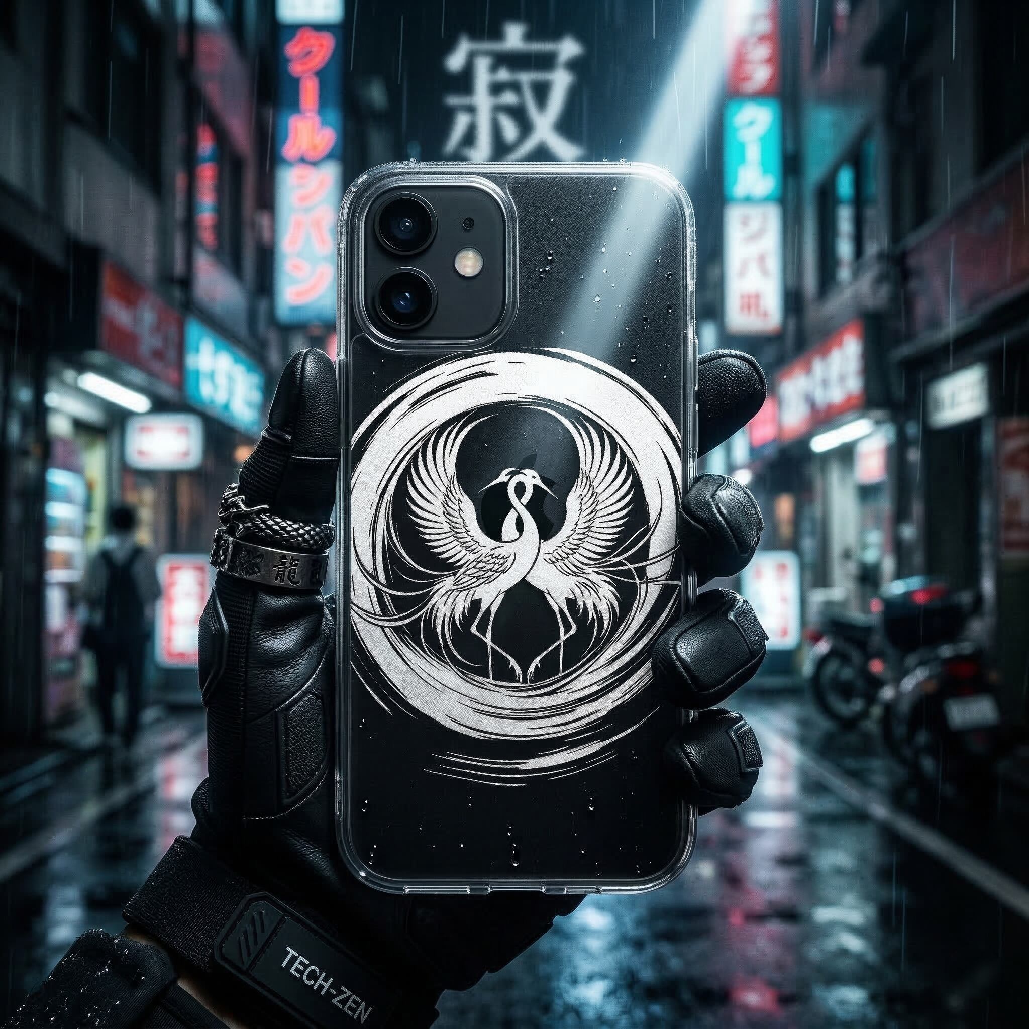 永遠の絆や夫婦円満の象徴である「鶴」を、躍動感あふれる水墨画のシルエットで表現。激しい筆の飛沫が神々しさを際立たせ、禅(Zen)の精神を感じさせます。ご自身のお守りや、大切な方への贈り物に最適な和柄ケースです。